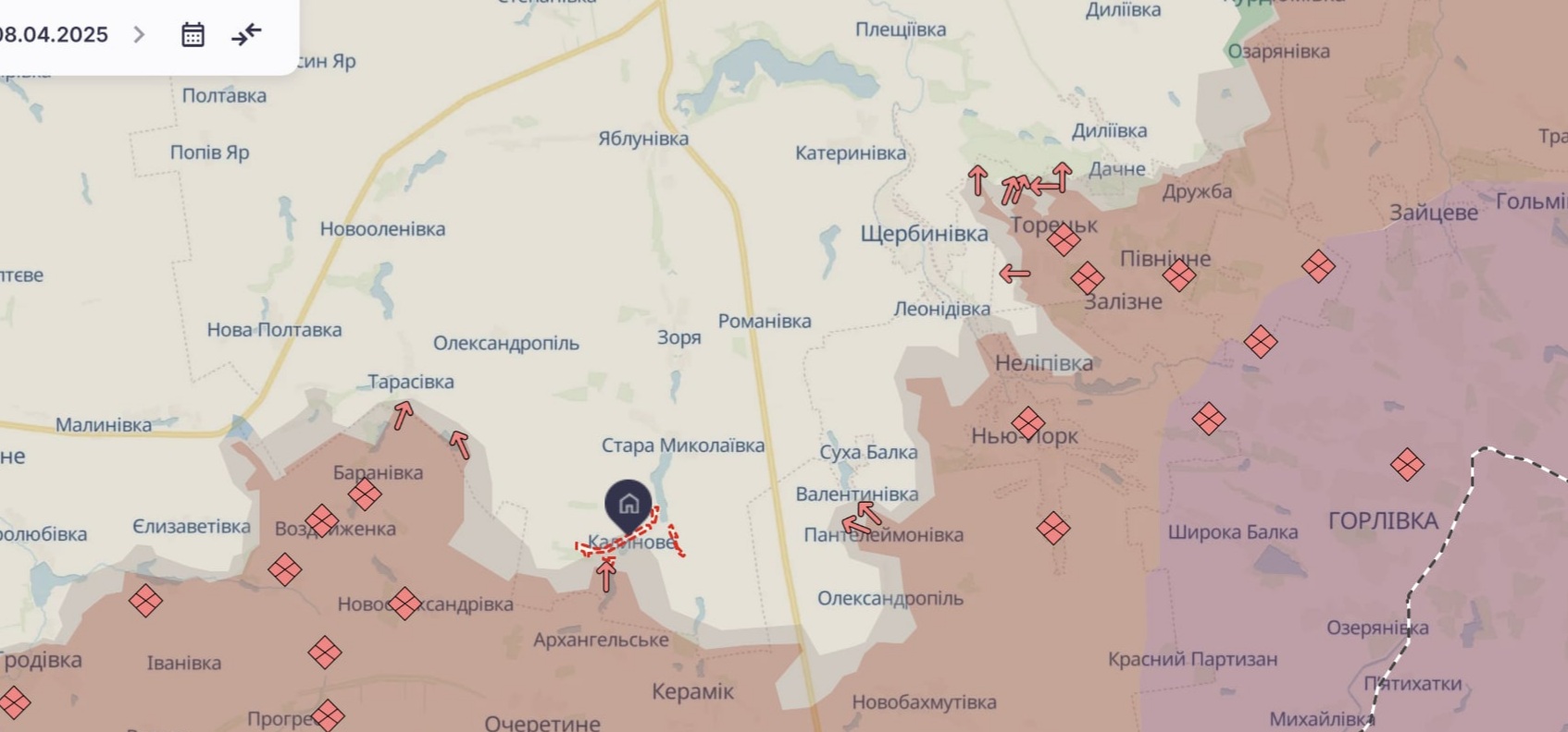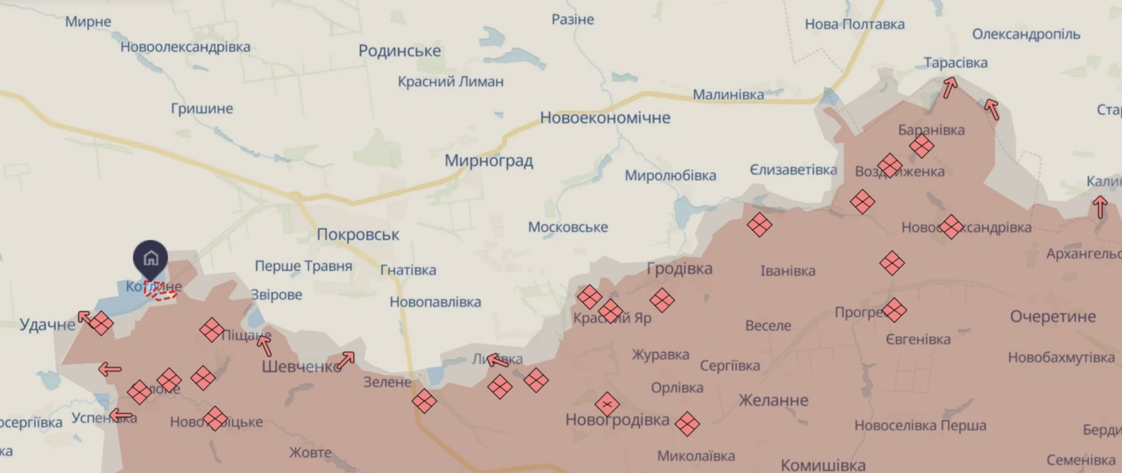 Аналітики інформаційного ресурсу DeepState повідомили, що Збройні Сили України повернули позиції поблизу селища Котлине на покровському напрямку, яке в лютому цього року звільнили від російських окупантів українські десантники.