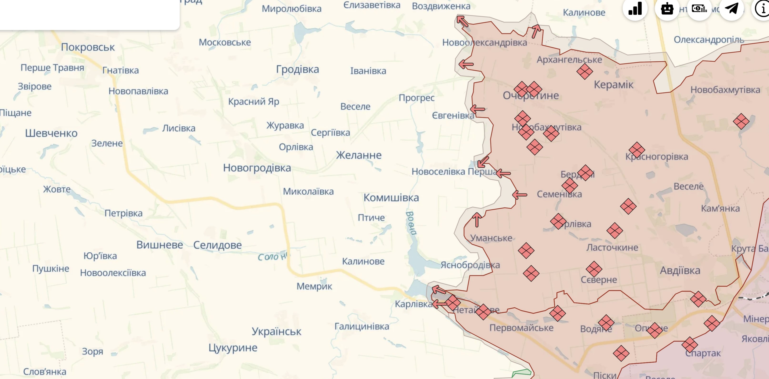 Російські війська і далі продовжують спроби протиснути оборону українських підрозділів на покровському напрямку. Лише за сьогодні росіяни 15 разів атакували позиції Збройних Сил України у районах Прогреса, Сокола, Євгенівки, Воздвиженки, Новоолександрівки, Новоселівки Першої, інформує Генштаб ЗСУ в Telegram.