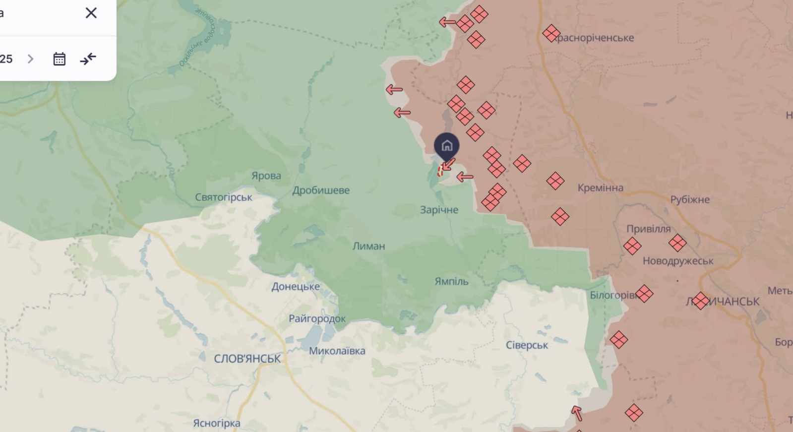 Аналітики інформаційного ресурсу DeepState сьогодні вдень повідомили, що російські окупаційні війська й далі просуваються в районі річки Жеребець на лиманському напрямку Донецької області. Там вказали, що після того, як окупанти захопили значну частину села Терни, вони зосередили ще більше сил та штурмів на інше село, яке розташоване поруч, — Ямполівка.