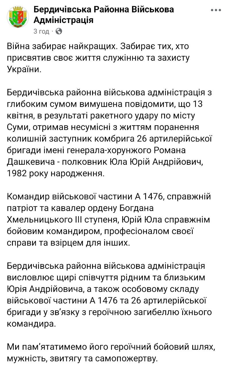"Війна забирає найкращих. Забирає тих, хто присвятив своє життя служінню та захисту України... 13 квітня, в результаті ракетного удару по місту Суми, отримав несумісні з життям поранення ... полковник Юла Юрій Андрійович, 1982 року народження. Командир військової частини А1476, справжній патріот та кавалер ордену Богдана Хмельницького III ступеня. Юрій Юла був справжнім бойовим командиром, професіоналом своєї справи та взірцем для інших", — сказано у повідомлення адміністрації.