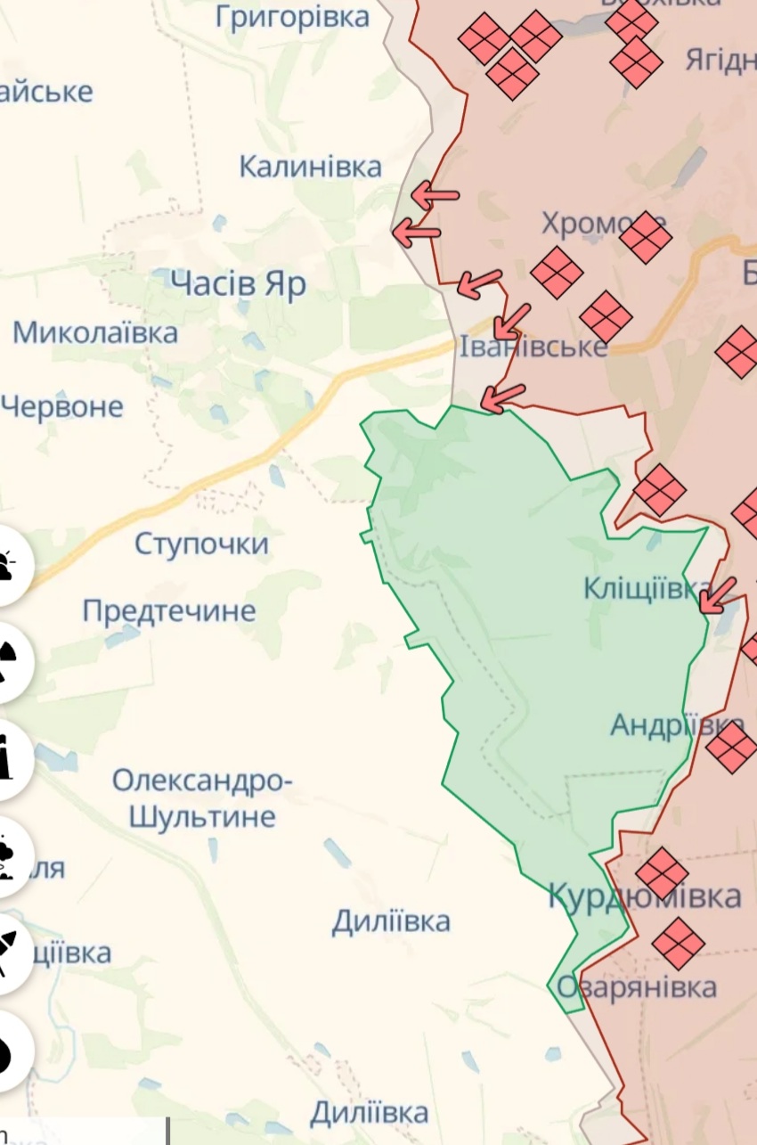 "Противник продовжує ударно-штурмові дії у напрямку населеного пункту Часів Яр. Також додатково штурмує Богданівку та Іванівське, намагаючись взяти передмістя в оперативне оточення. Два дні тому, 5 квітня, ворогом спочатку була здійснена масована артпідготовка, застосовувалася ствольна артилерія, системи реактивного вогню типу "Град", "Ураган". Після цього пішли ударно-штурмові дії", - наголосив військовий.