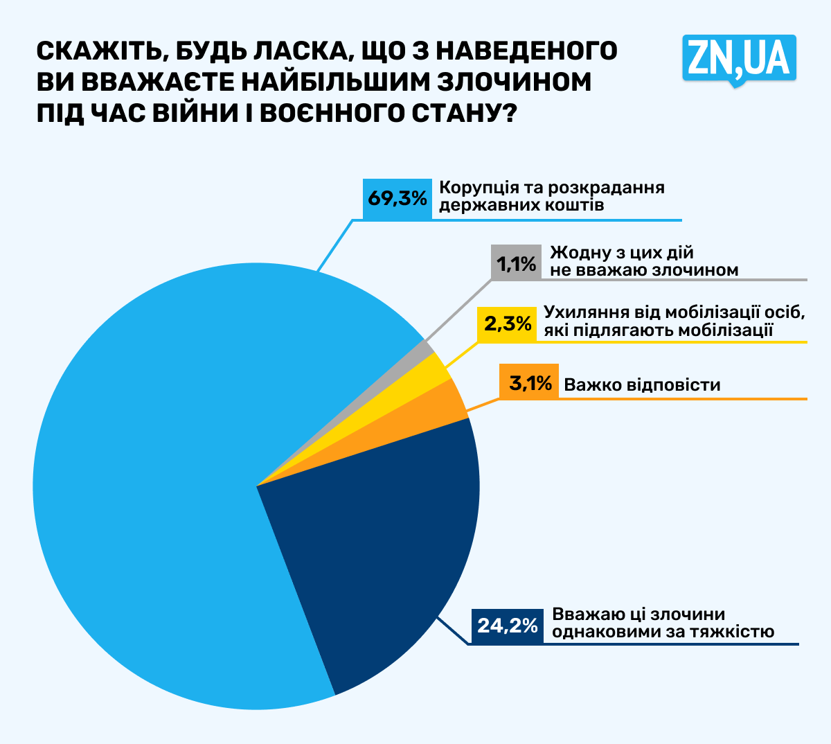 Унаслідок (див. рис.1) із величезним відривом «перемогла» корупція. Найбільшим злочином її вважають 69,3% українців. За ухиляння від мобілізації тих, хто їй підлягає, «проголосували» 2,3% українців. Рівнозначними за вагою злочинами визнали ці явища 24,2% респондентів…