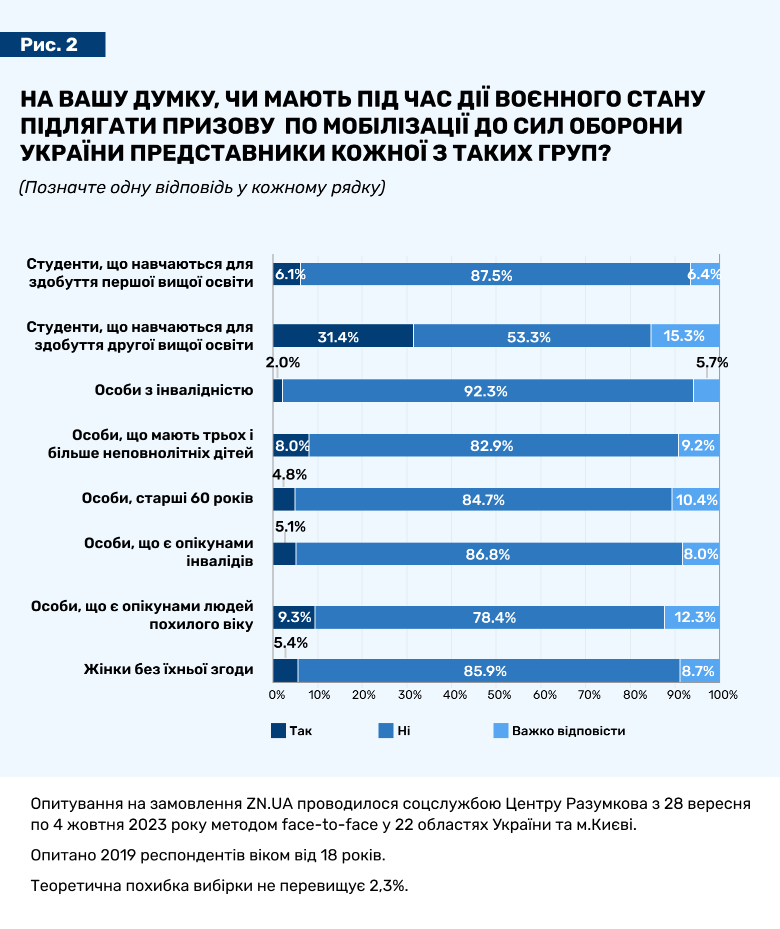 Тим паче законодавство надає цілком достатню кількість легальних способів не потрапити під мобілізацію. І судячи з того ж опитування (запитання звучало так: «На Вашу думку, чи повинні під час дії воєнного стану підлягати призову за мобілізацією до Сил оборони України представники кожної з таких груп?»), суспільство охоче їх підтримує (див. рис. 2). Усі категорії, які на сьогодні не підлягають мобілізації, «схвалені» респондентами обох статей таким чином: особи з інвалідністю — 92,3% (91,6% чоловіків, 92,8% жінок); студенти, які здобувають першу вищу освіту, — 87,5% (86 і 88,8% відповідно); опікуни осіб із інвалідністю — 86,8% (85,7 і 87,9%); жінки без їхньої згоди — 85,9% (85,2 і 86,5%); особи, старші за 60 років, — 84,7% (84,5 і 85%); особи, які мають трьох і більше неповнолітніх дітей, — 82,9% (по 82,9%); опікуни людей похилого віку — 78,4% (77,9 і 78,8%); студенти, які здобувають другу вищу освіту, — 53,3% (52,2 і 54,1%).