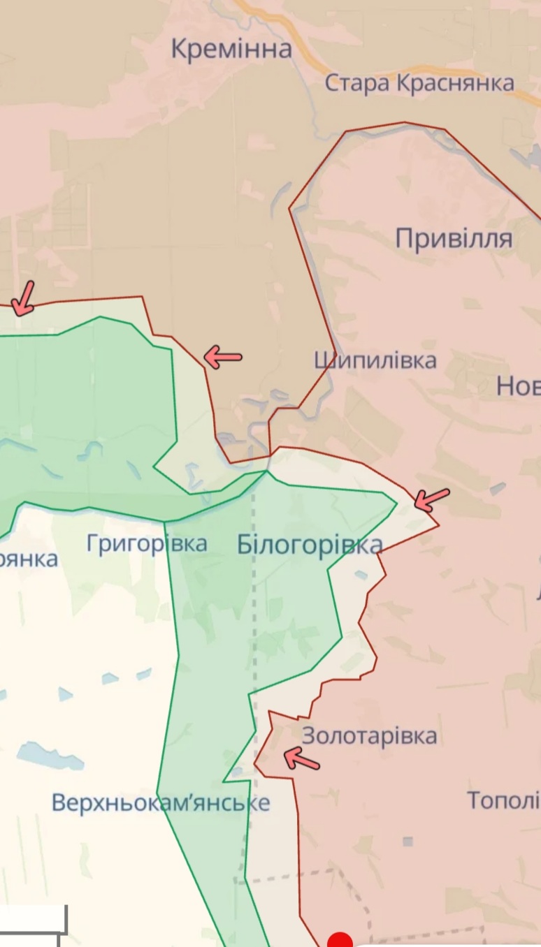 "Геолокаційні кадри, розміщені 24 квітня, показують, що українські сили домоглися незначних успіхів на північний схід від Верхньокам'янського (18 км на південь від Кремінної) і на південний схід від Білогорівки (12 км на південь від Кремінної) у невстановлені дати", - йдеться в повідомленні.