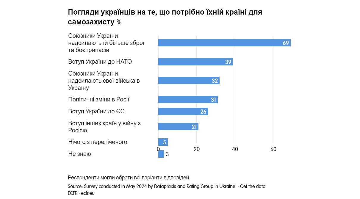 «З точки зору того, як вони можуть виграти війну, українці вважають, що отримання більшої кількості зброї та боєприпасів є єдиним значущим способом покращити свої шанси на перемогу», – йдеться у звіті ECFR.