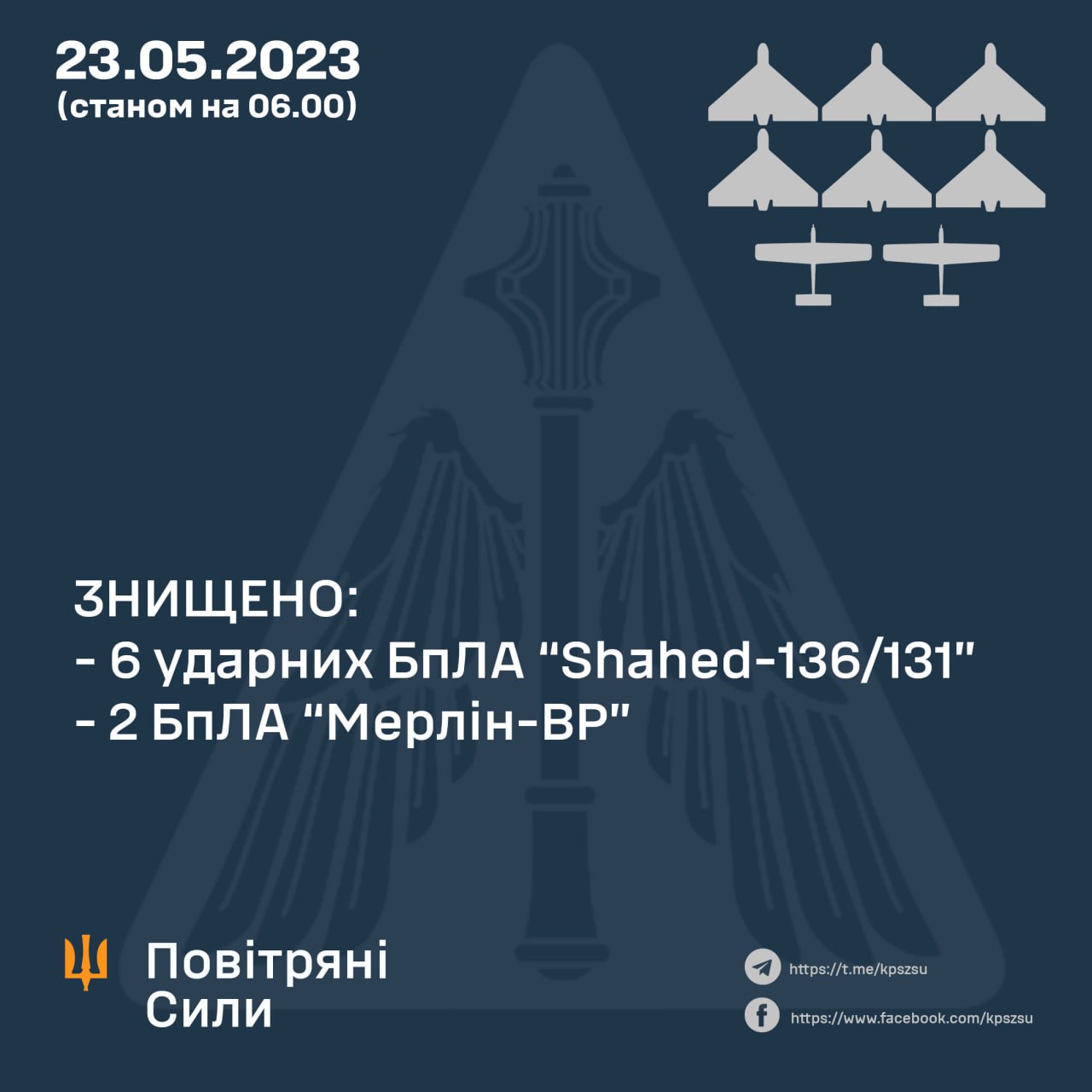 "Уночі 23 травня 2023 року на різних напрямках знищено шість ворожих ударних БПЛА Shahed-136/131 та два розвідувальні БПЛА "Мерлін-ВР" за минулу добу 22 травня", – повідомляє пресслужба ГШ ЗСУ.