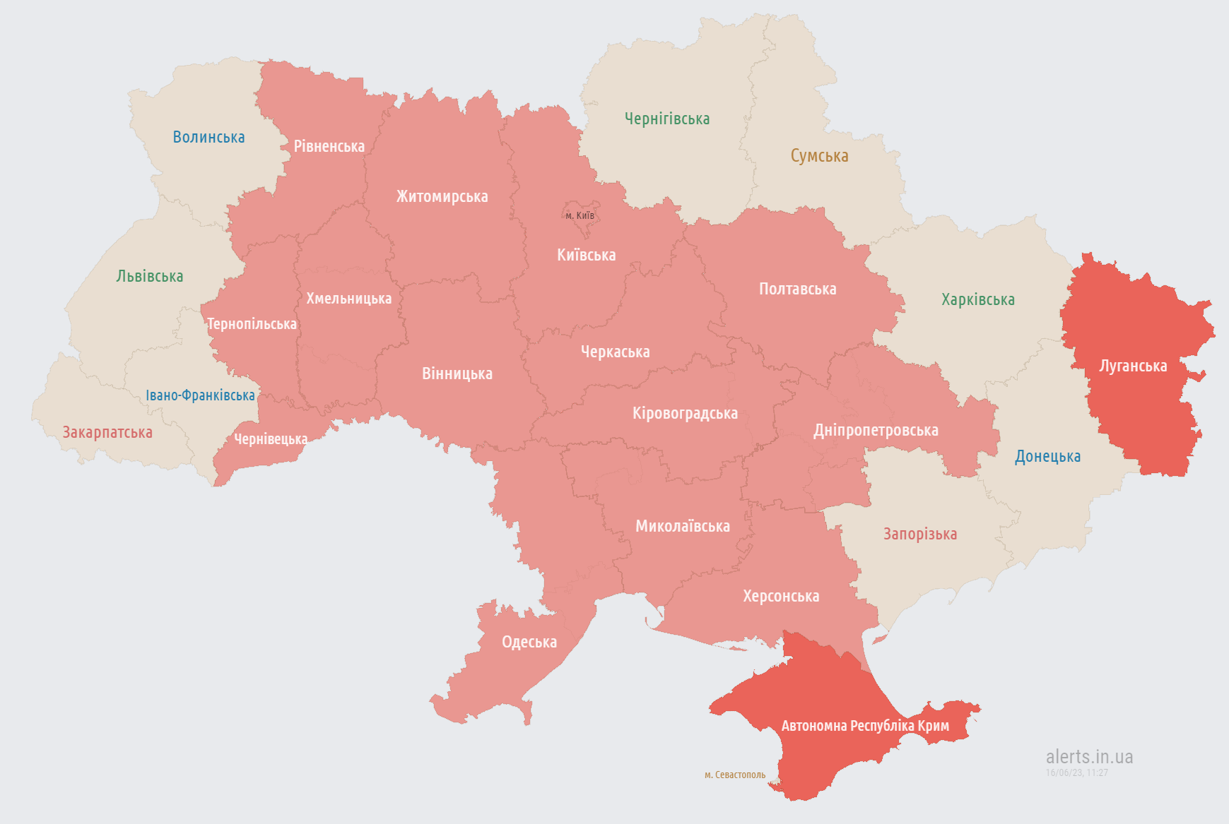 В центральних, південних та частині північних областей України оголошено повітряну тривогу через зафіксований рух ракет типу "Калібр" з акваторії Чорного моря, повідомили в Повітряних силах України.