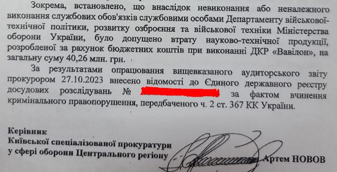 За даними джерел видання, кілька місяців тому прокуратура розпочала досудове розслідування щодо неналежного виконання службових обов’язків, яке призвело до тяжких наслідків (ч. 2 ст. 367 Кримінального кодексу), причетними до зриву проєкту. Це сталося після проведення Міністерством оборони внутрішнього аудиту в 2023 році. Автор тексту "ЕП" назвав історію "Вавілону" “еталонною відповіддю на питання, чому Україна під час війни самотужки не виробляє окремі дефіцитні види озброєння”.