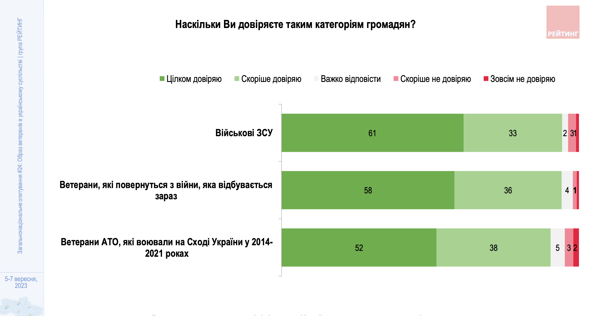 Опитування проведене з 5 по 7 вересня цього року з ініціативи "Українського ветеранського фонду" Міністерства у справах ветеранів України, а профінансоване соціологічною групою "Рейтинг". Аудиторія - населення віком від 18 років в усіх областях, крім тимчасово окупованих територій Криму та Донбасу, а також територій, де на момент опитування відсутній український мобільний зв'язок. Участь в ньому взяли тисяча респондентів. Вибірка репрезентативна за віком, статтю і типом поселення. Похибка становить не більше 3,1%.
