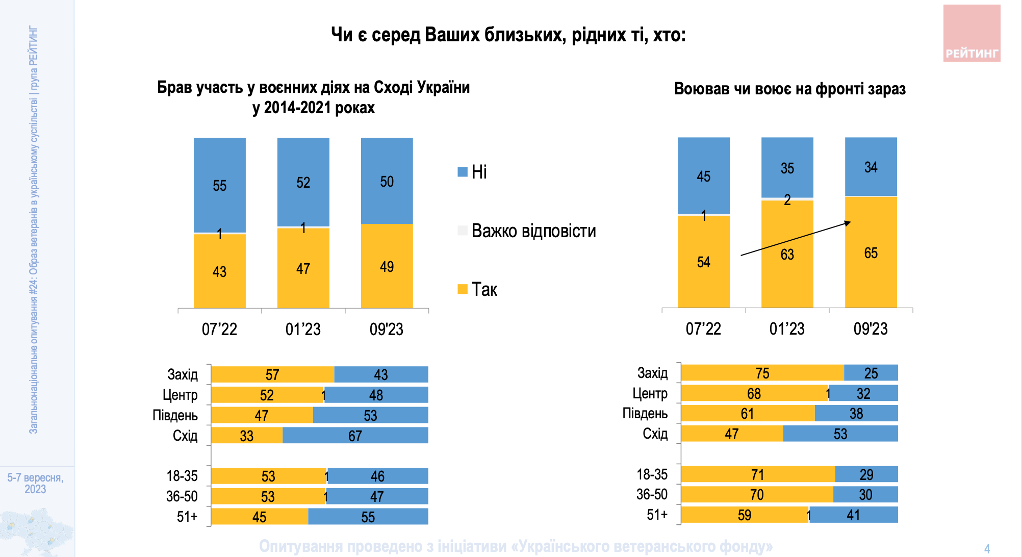 Воно й не дивно, адже в Україні зросла кількість тих, чиї рідні та близькі воювали або воюють на фронті сьогодні. У 49% - це люди, котрі боронили країну з 2014-2021 роки, а у 65% громадян це близькі, які стали на захист нашої держави після початку повномасштабного вторгнення.
