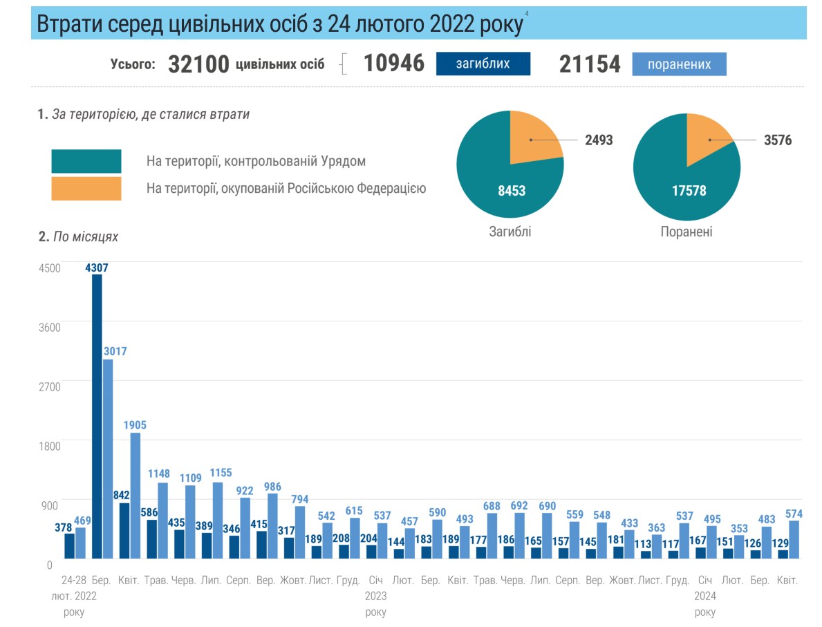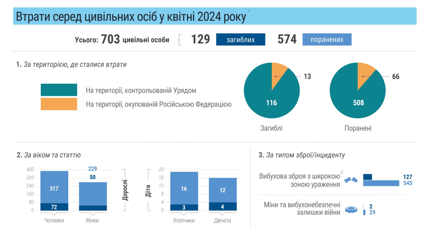 “У квітні 2024 року в Україні загинули щонайменше 129 цивільних осіб і 574 отримали поранення. Якщо у квітні кількість загиблих порівняно з попереднім місяцем незначно зросла, то кількість поранених цивільних осіб суттєво зросла за останні два місяці”, – повідомляється у звіті.