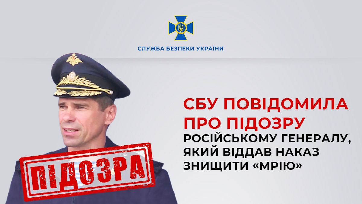 Служба безпеки України повідомила про підозру заступнику командувача повітряно-десантними військами ЗС РФ, генерал-лейтенанту Анатолію Концевому, за наказом якого окупанти захопили Гостомельський аеропорт у лютому 2022-го і знищили найбільший у світі літак АН-225 «Мрія», повідомляє пресслужба СБУ.