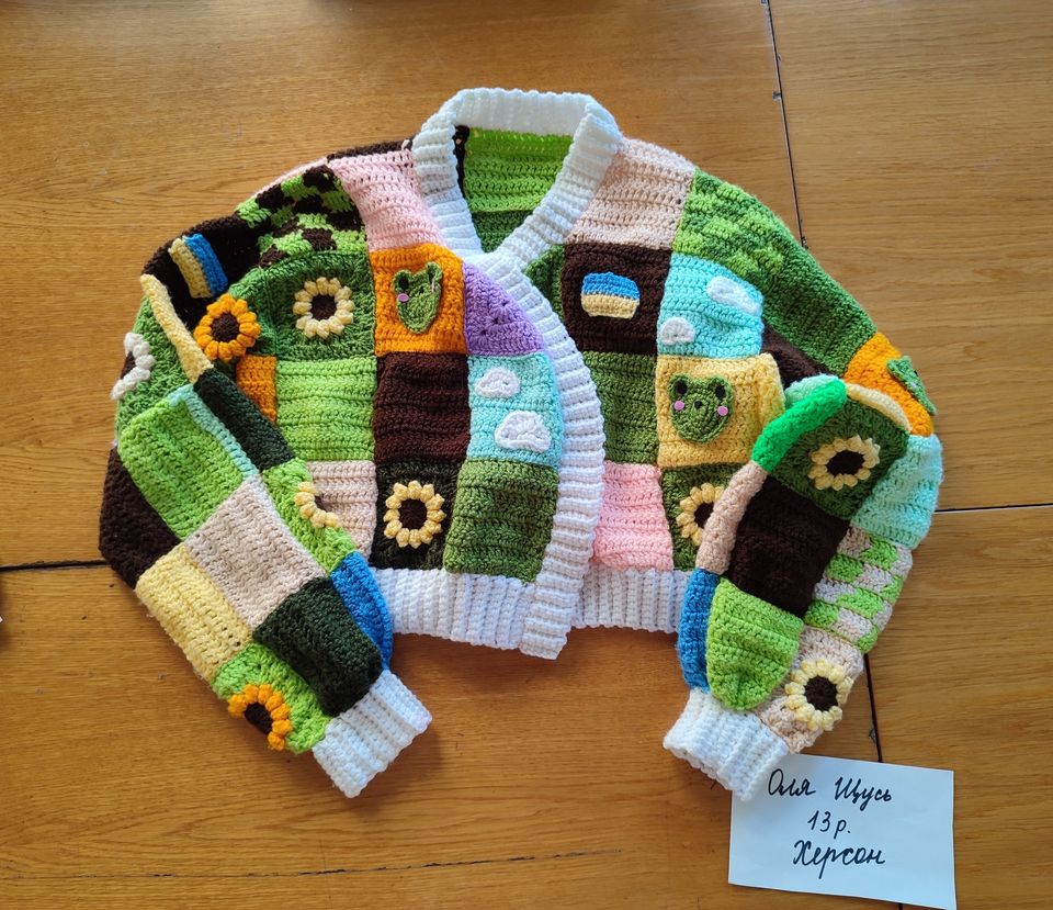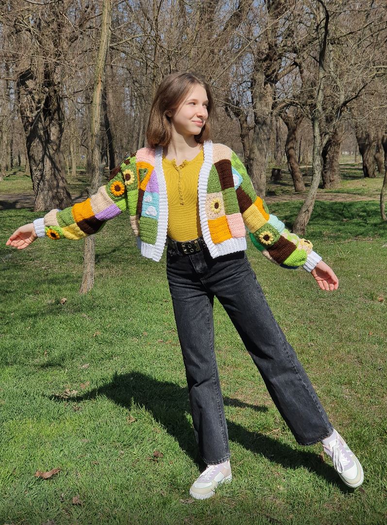 «Тоді я почала плести теплий кардиган. Я якось дуже швидко його зв’язала, за вісім днів, у підвалі. — згадує Оля. — Так швидко вийшло. Мені дуже подобається створювати власний одяг. Найбільше виходить в’язати на спицях або гачком. Тоді я намагалась абстрагуватись від вибухів. Вже потім я придумала для нього назву — кардиган «Україна». Я виплела по ньому соняхи.