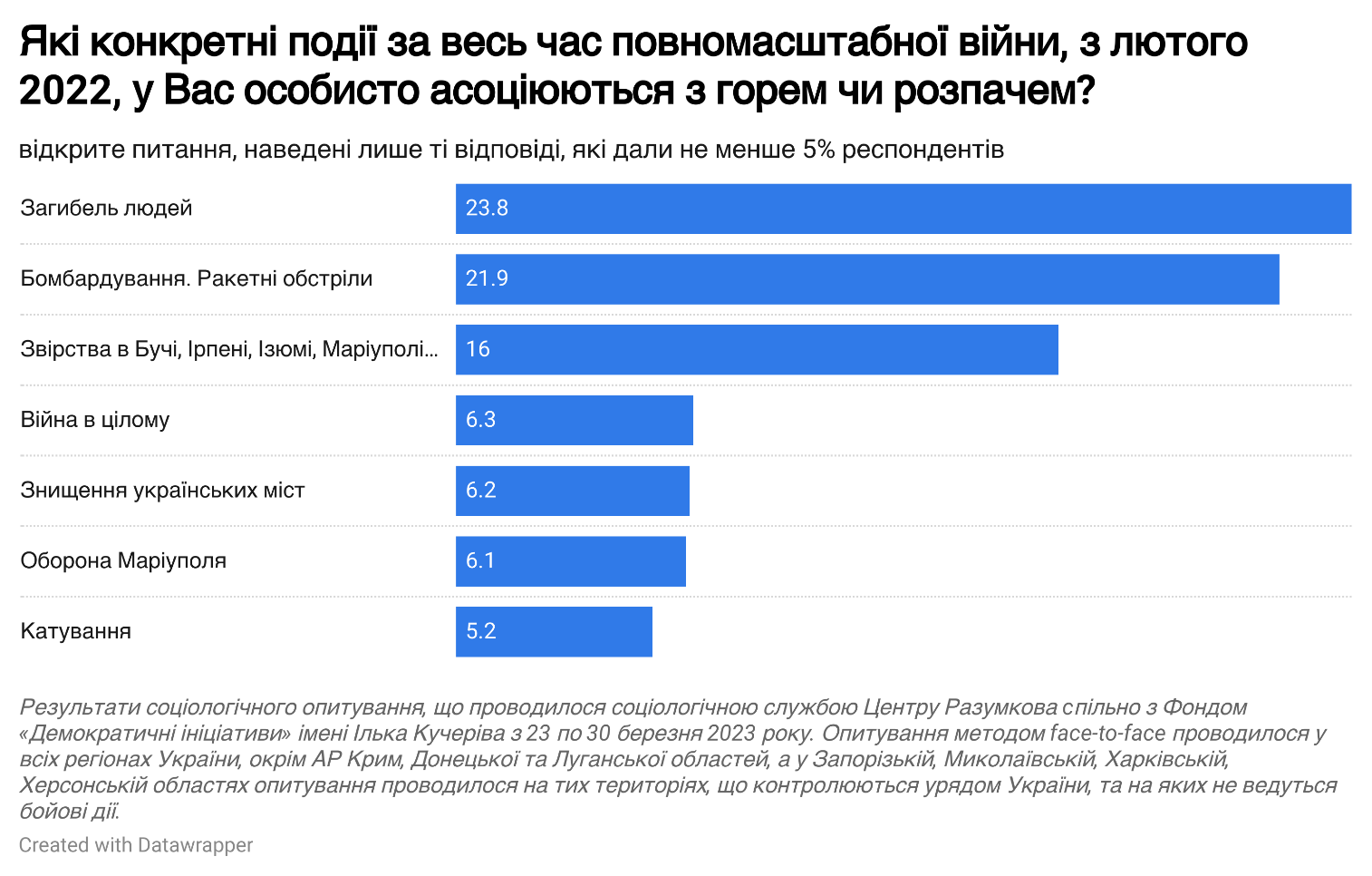 Ми поставили кілька відкритих запитань, щоб дізнатися, якою буде спонтанна реакція громадян, що засвідчить найбільш пам’ятні події, пов’язані з болем та розпачем, гордістю і перемогою, надією та оптимізмом. Опитування підтвердило, що війна в народній пам’яті залишається насамперед як спогад про загибель людей (23,8%), руйнування, завдані обстрілами і ракетними атаками (21,9%), звірства російських військ у Бучі, Ірпені, Маріуполі, Ізюмі та інших містах (16%). Особливо вкарбувалися в народну пам’ять злочини росіян у Бучі, знищення драмтеатру в Маріуполі, страта полонених із гарнізону «Азовсталь» в Оленівці, злочини в Ізюмі, ракетні атаки на житлові багатоповерхівки в Одесі, Дніпрі, Запоріжжі, Кривому Розі, Краматорську, масове викрадення дітей з окупованих українських територій.