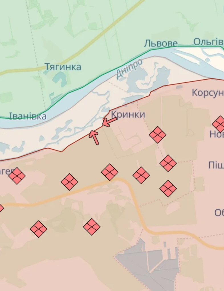 Вйська РФ намагаються вибити підрозділи Збройних Сил України з плацдарму в районі села Кринки Херсонської області, однак після наступальних дій із Кринок не повертається 60-70% штурмових груп армії РФ, зазначила речниця Оперативного командування "Південь" Наталія Гуменюк.