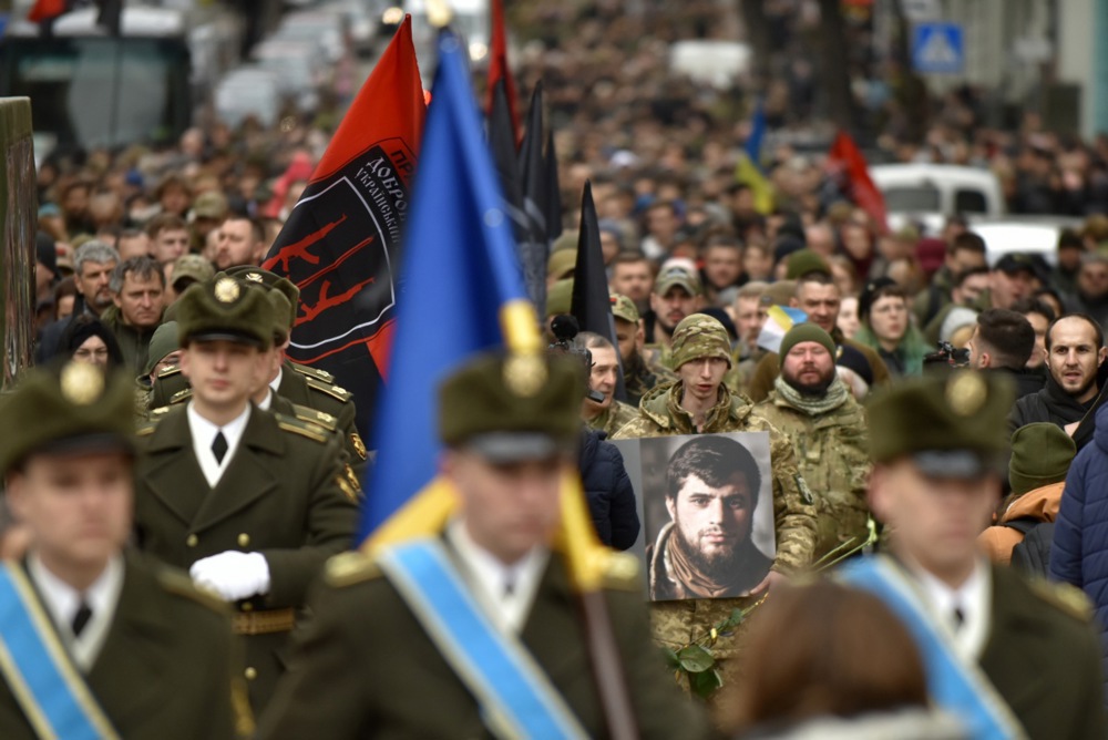Тисячі людей взяли участь у похоронній процесії під час прощання з Дмитром Коцюбайлом в Києві 10 березня 2023 року.