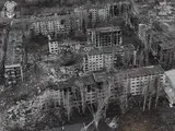 На кадрах — вигорілі багатоповерхівки, зруйнований дитячий садок, пошкоджений храм. Колишні житлові квартали, місця роботи й повсякденного життя перетворилися на згарища.