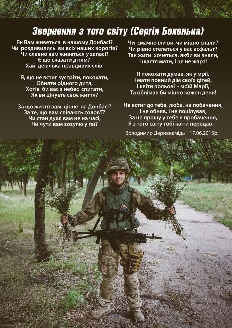 «За два роки в Афганістані у мене не загинув жоден солдат, — розповідає чоловік. — А за чотири місяці в батальйоні «Донбас» я втратив дев’ятьох хлопців. Це були дуже близькі для мене люди. Наприклад Сергій Бохонько, який усе просив, щоб я познайомив його зі своєю донькою. Цей чистий, прекрасний молодий хлопець чіплявся за якусь надію, щоб хтось чекав. Я дивився на нього й думав: «Боже, невже його вб'ють?». Серьожа був одним із перших добровольців, які загинули біля Попасної. Я відправляв його додому як «вантаж 200». Було дуже важко, хоч я й чоловік із досвідом, у віці. Ті молоді побратими були для мене як діти».