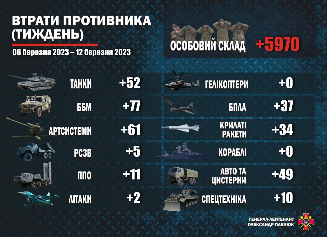 Українські захисники ліквідували з 6 по 12 березня 5 970 російських військових, заявив перший заступник міністра оборони, генерал-лейтенант Олександр Павлюк у Telegram.