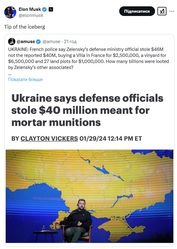 Американский миллиардер и ближайший соратник Дональда Трампа Илон Маск распространил в соцсети Х ложную информацию о том, что "чиновник Министерства обороны Зеленского" украл 46 миллионов долларов и купил недвижимость у Франции. Он перепостил ее из комментариев - "верхушка айсберга".