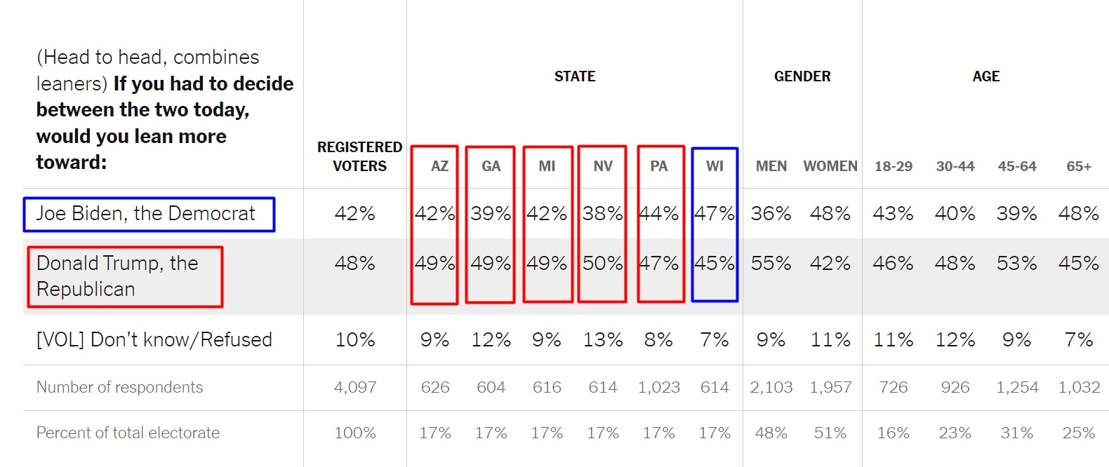 Результаты показывают, что Трамп опережает Байдена среди зарегистрированных избирателей в пяти из шести ключевых штатов: Мичиган, Аризона, Невада, Джорджия и Пенсильвания. Байден лидирует среди зарегистрированных избирателей только в одном штате – Висконсине. На выборах в 2020 году Байден одержал победу во всех шести ключевых штатах.