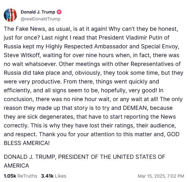 “Фейковые новости, как обычно, снова принялись за дело. Почему они не могут быть честными хотя бы раз? Вчера вечером я прочитал, что президент России Владимир Путин заставил моего почтеннейшего посла и специального посланника Стива Уиткоффа ждать более девяти часов, хотя на самом деле никакого ожидания не было”, – отметил президент США.