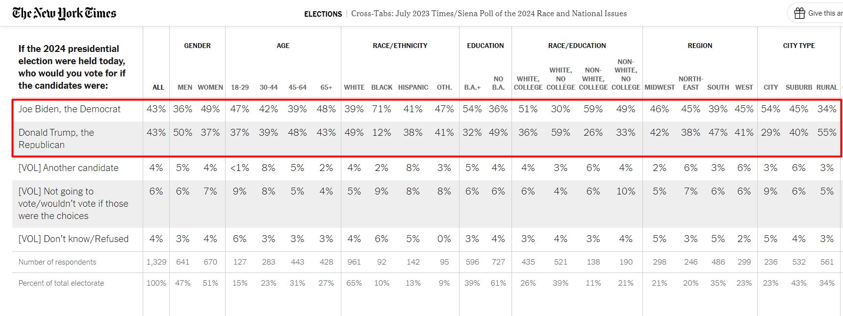 При этом Байдена поддерживают 87% тех, кто и на выборах 2020 года, а Трампа – 91%. Трамп преобладает над Байденом только в одной возрастной категории (45-64 года) с результатом 48% против 39%, а в других проигрывает. Также действующий президент Байден опережает Трампа во всех регионах, кроме Юга, где его результат составляет 39%, а у Трампа – 47%. Также Трамп традиционно более популярен в сельской местности (55%), в то время как Байден преобладает в городах (54%) и пригородах (45%).