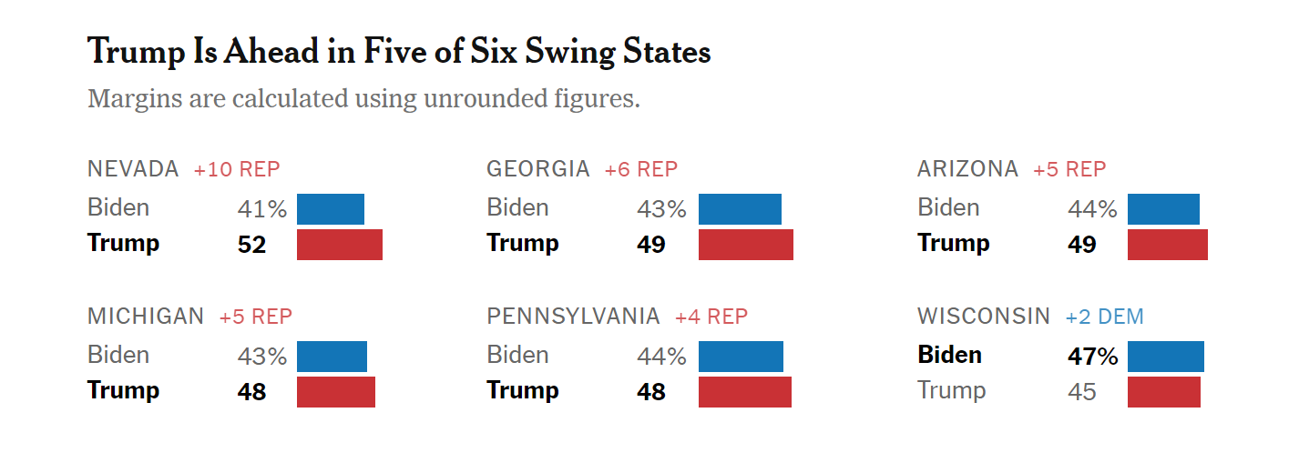 Байден проигрывает Трампу с разницей от 3 до 10% среди зарегистрированных избирателей в Аризоне, Джорджии, Мичигане, Неваде и Пенсильвании, свидетельствуют результаты опроса, проведенного The New York Times и Сиенским колледжем. Байден опережает Трампа только в Висконсине на 2%.