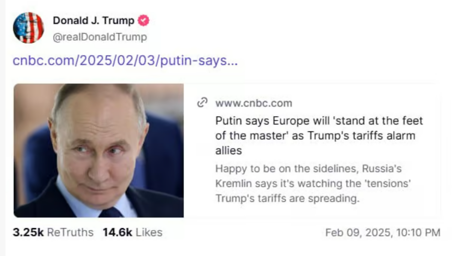 Президент США Дональд Трамп совершил репост заявления российского диктатора Владимира Путина о том, что Европа "встанет у ног своего хозяина" – так Путин назвал американского президента.