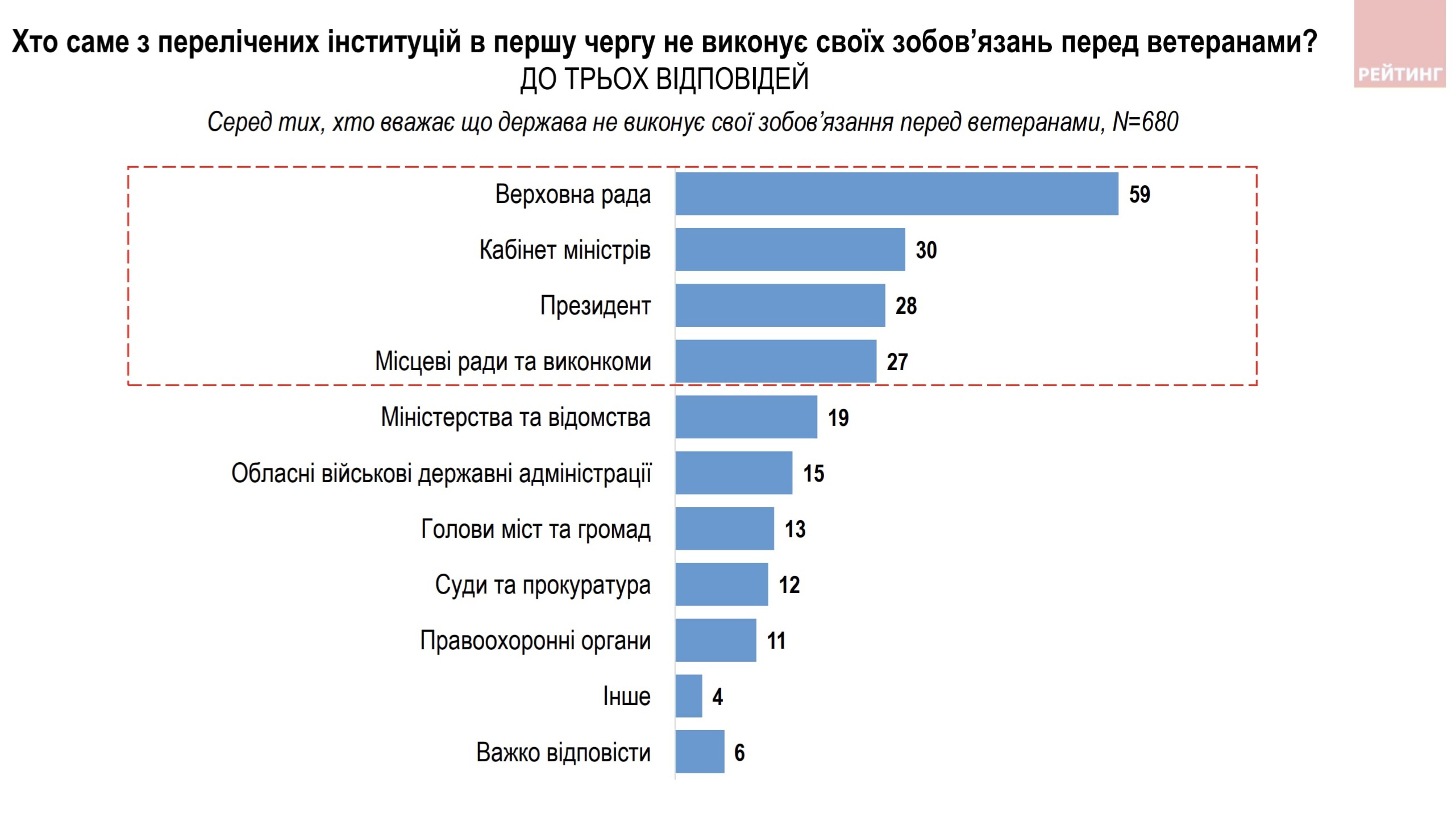 Среди граждан, которые считают, что государство не выполняет свои обязательства перед ветеранами, абсолютное большинство утверждает, что в первую очередь этого не делают такие институции: Верховная Рада (59%), Кабинет Министров (30%), президент (28%), местные рады и исполкомы (27%), министерства и ведомства (19%).