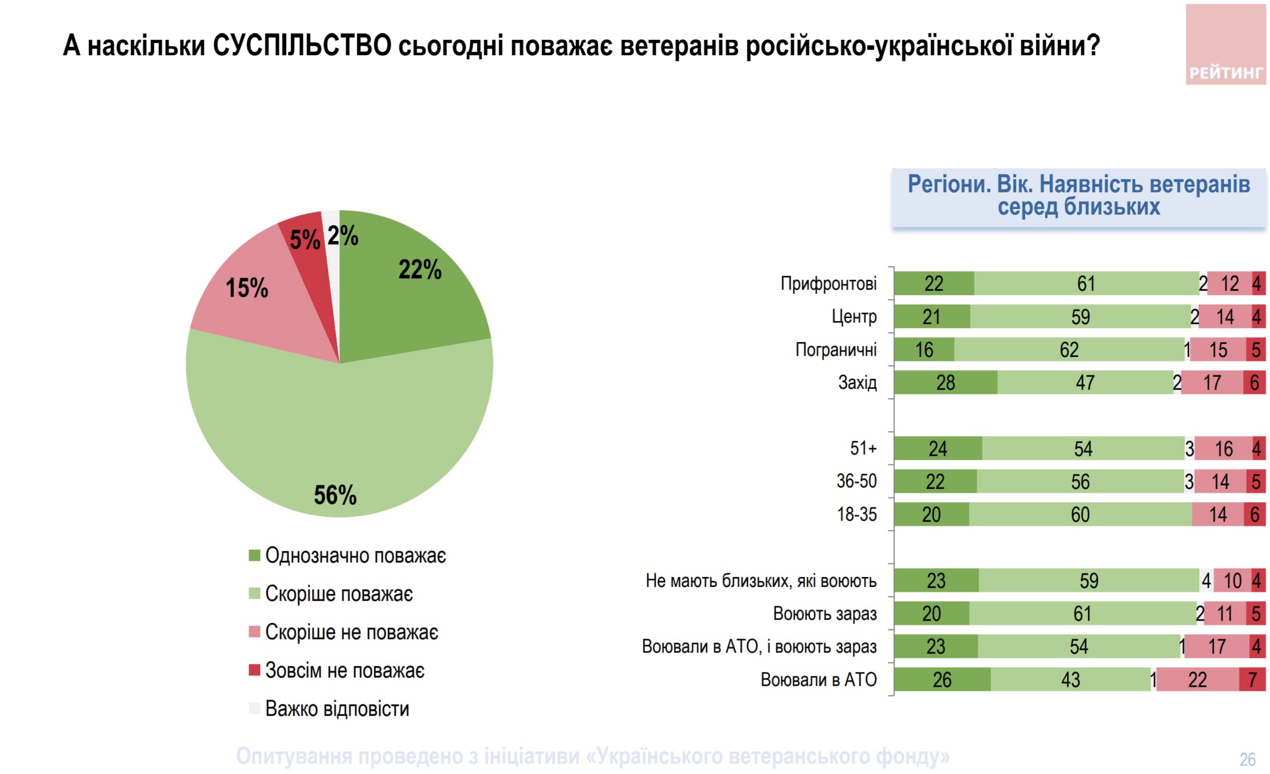 По мнению 78% респондентов, общество уважает ветеранов. Имеет противоположное мнение — 17%. Кроме того, 53% граждан указывают на неэффективность государственных программ по созданию инклюзивного пространства для лиц с инвалидностью, 37% — противоположного мнения. Жители прифронтовых и центральных областей, родственники воевавших в АТО и ныне воюющих, а также старшее население чаще указывали на неэффективность таких программ.