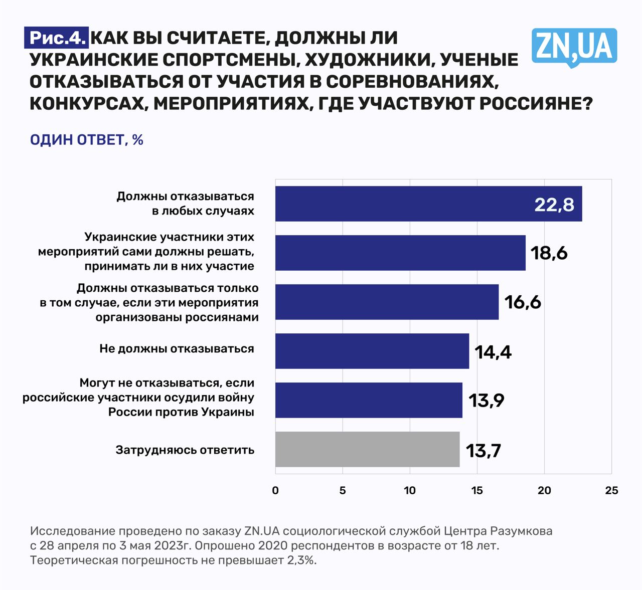 В ответ на вопрос "Как вы считаете, должны ли украинские спортсмены, художники, ученые отказываться от участия в соревнованиях, конкурсах, мероприятиях, где принимают участие россияне?" 22,8% респондентов четко сказали: "Должны отказываться". Еще 16,6% предложили отказываться при условии, что мероприятия организованы представителями РФ. "То есть культуру бойкота полностью поддерживают 39,4% украинцев", – отметила Смола.