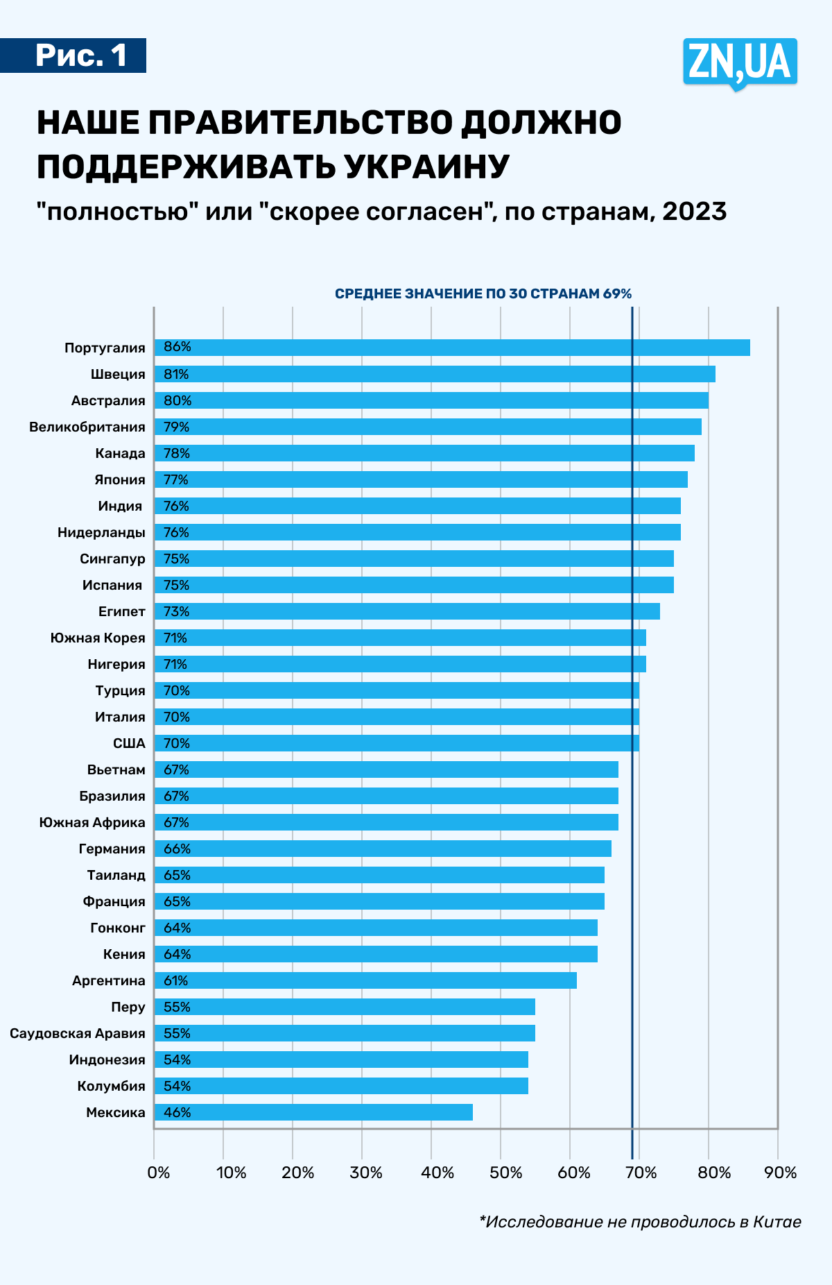 По результатам опроса GlobeScan, в ряде стран Латинской Америки, Африки и Южной Азии отношение к борьбе Украины лучше, чем в таких устоявшихся европейских демократиях, как Франция или Германия. В странах-соседях в Латинской Америке и Азии также заметны существенные отличия в оценке важности оказывать помощь Украине.
