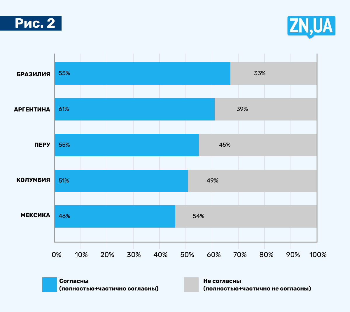 В Мексике 46% опрошенных согласны полностью/частично помогать Украине и 54% - не согласны.