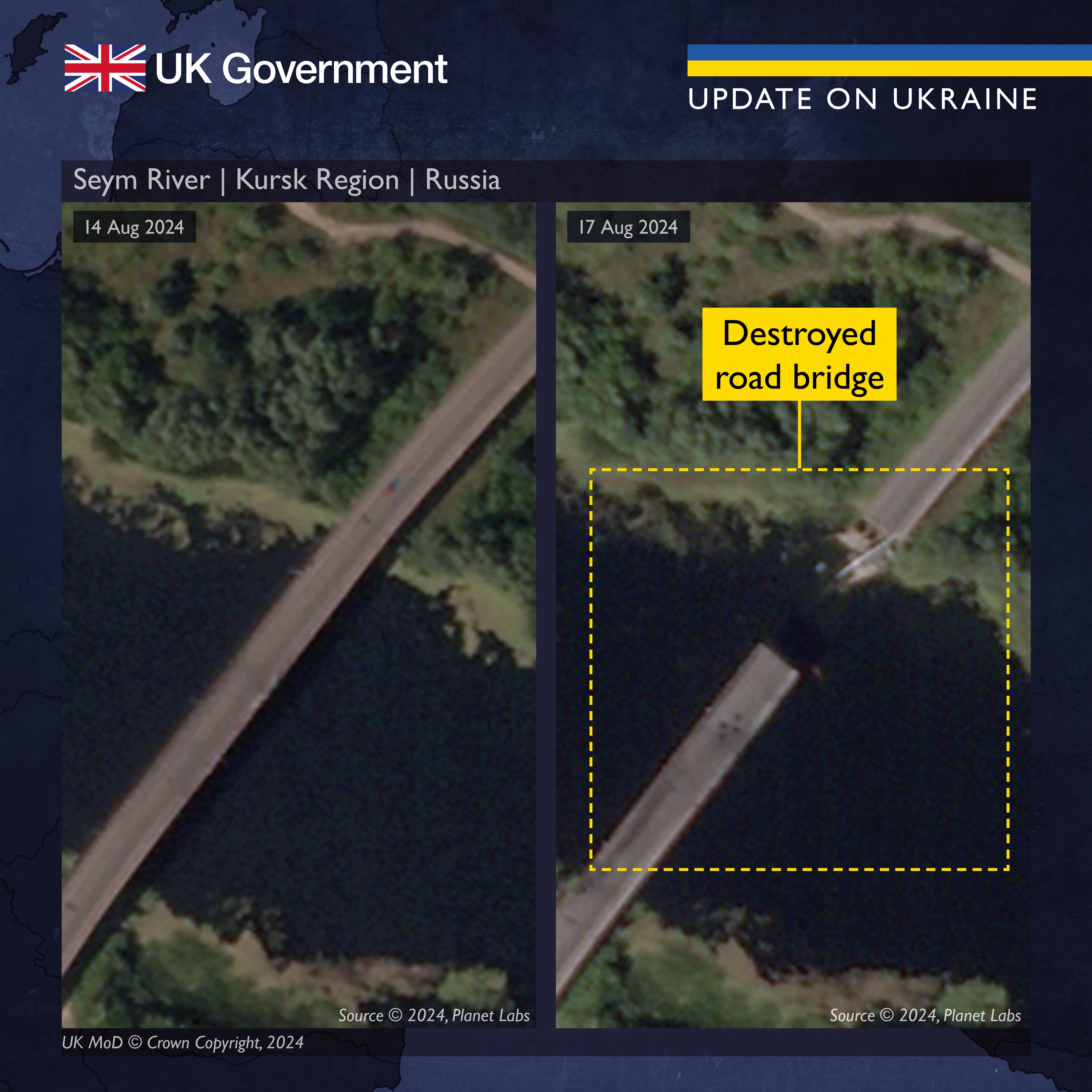 В разведке Британии показали спутниковые фото автомобильных мостов и понтонных переправ через реку Сейм, которые защитники ликвидировали в Курской области. В сообщении на своей странице в соцсети X британцы подчеркнули, что от логистических объектов почти ничего не осталось.
