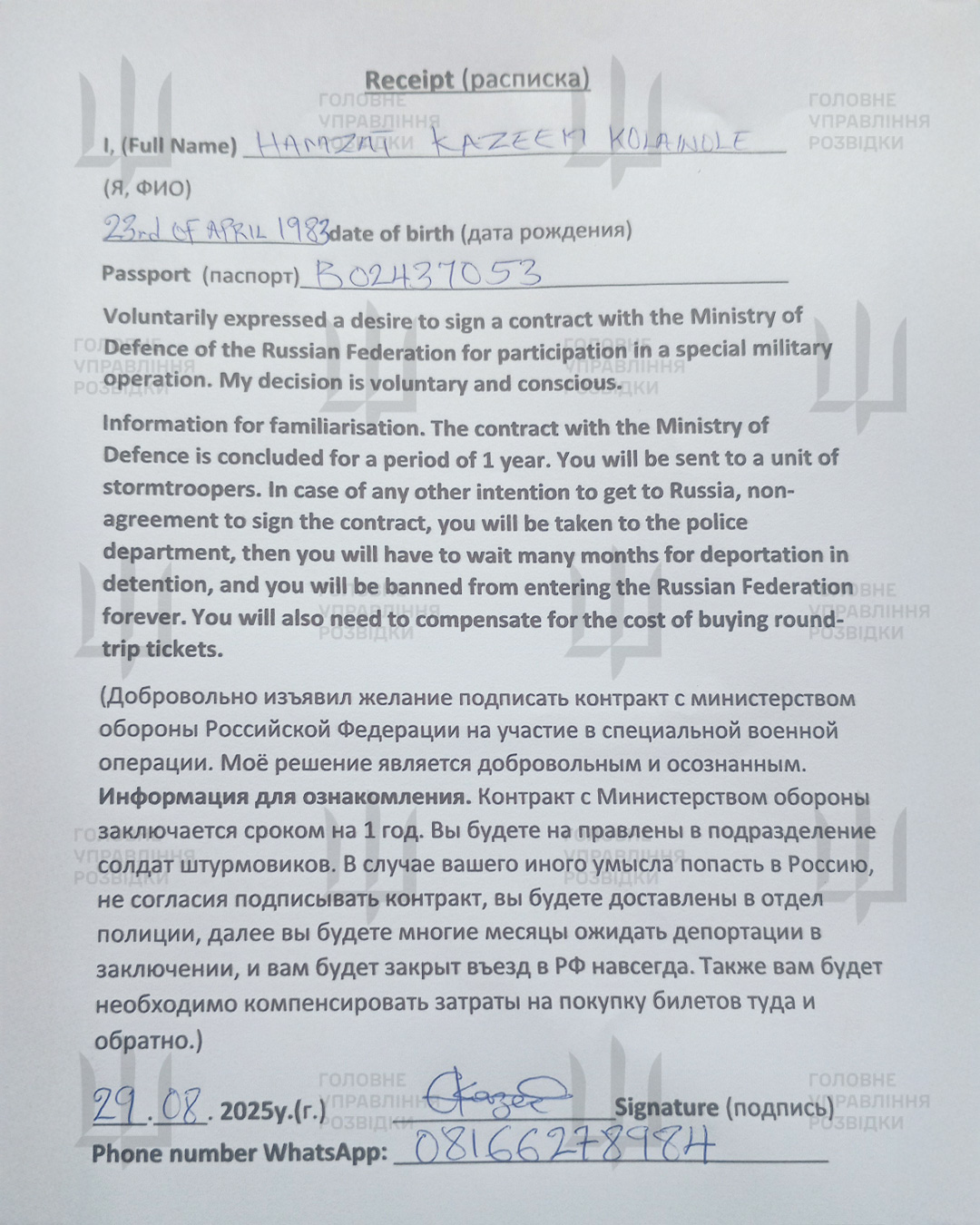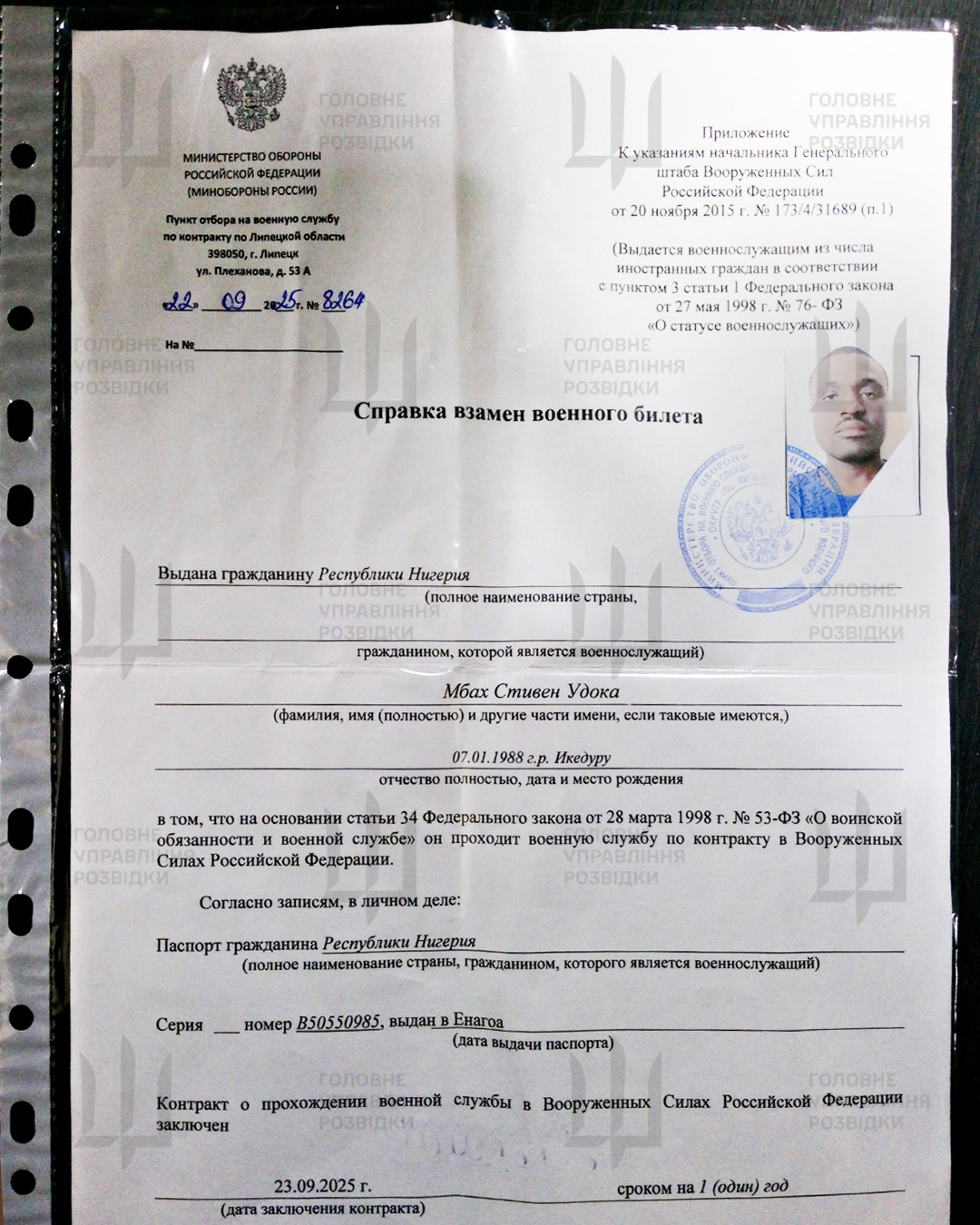 Оба нигерийца подписали контракт с армией РФ в августе и сентябре прошлого года. Удоку через пять дней после подписания контракта зачислили в часть и направили на временно оккупированные территории Украины. Документы о военной подготовке Калаволе отсутствуют, однако в ГУР предполагают, что он тоже не проходил военной подготовки. У Калаволе остались трое детей и жена в Нигерии.
