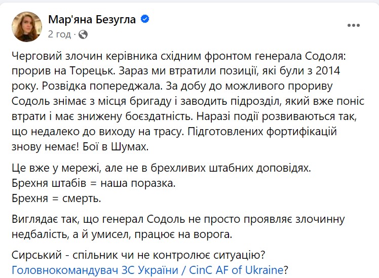 "Выглядит так, что генерал Содоль не просто проявляет преступную халатность, но и умысел, работает на врага. [Главнокомандующий ВСУ] Сырский – сообщник или не контролирует ситуацию?”, – пишет Безугла.