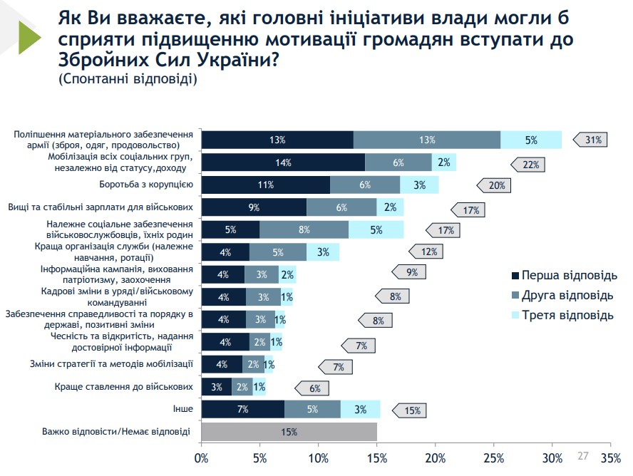 Подавляющее большинство опрошенных украинцев считают, что основными причинами, почему люди не хотят мобилизоваться в ряды ВСУ, являются страх смерти, инвалидности, плена, неопределенности. Также большинство опрошенных считают, что повысить уровень мотивации могло бы улучшение материального обеспечения армии (оружие, одежда, продовольствие), а также мобилизация всех социальных групп вне зависимости от статуса и дохода. Об этом свидетельствуют результаты социологического исследования группы «Рейтинг» по заказу Международного республиканского института (IRI).