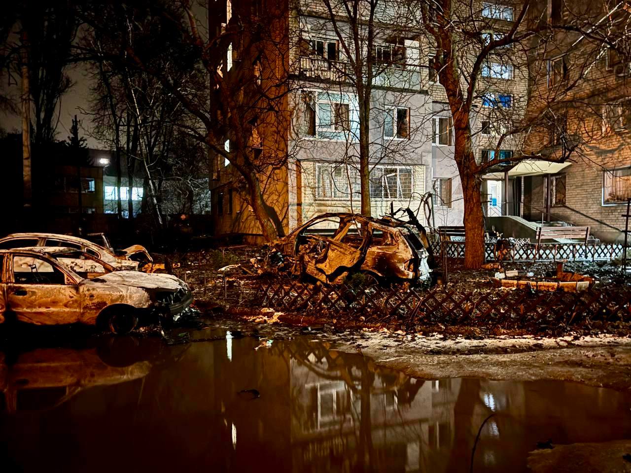 В соцсетях местные жители выкладывают видео с последствиями атаки, на которых видно уничтоженные автомобили возле дома.