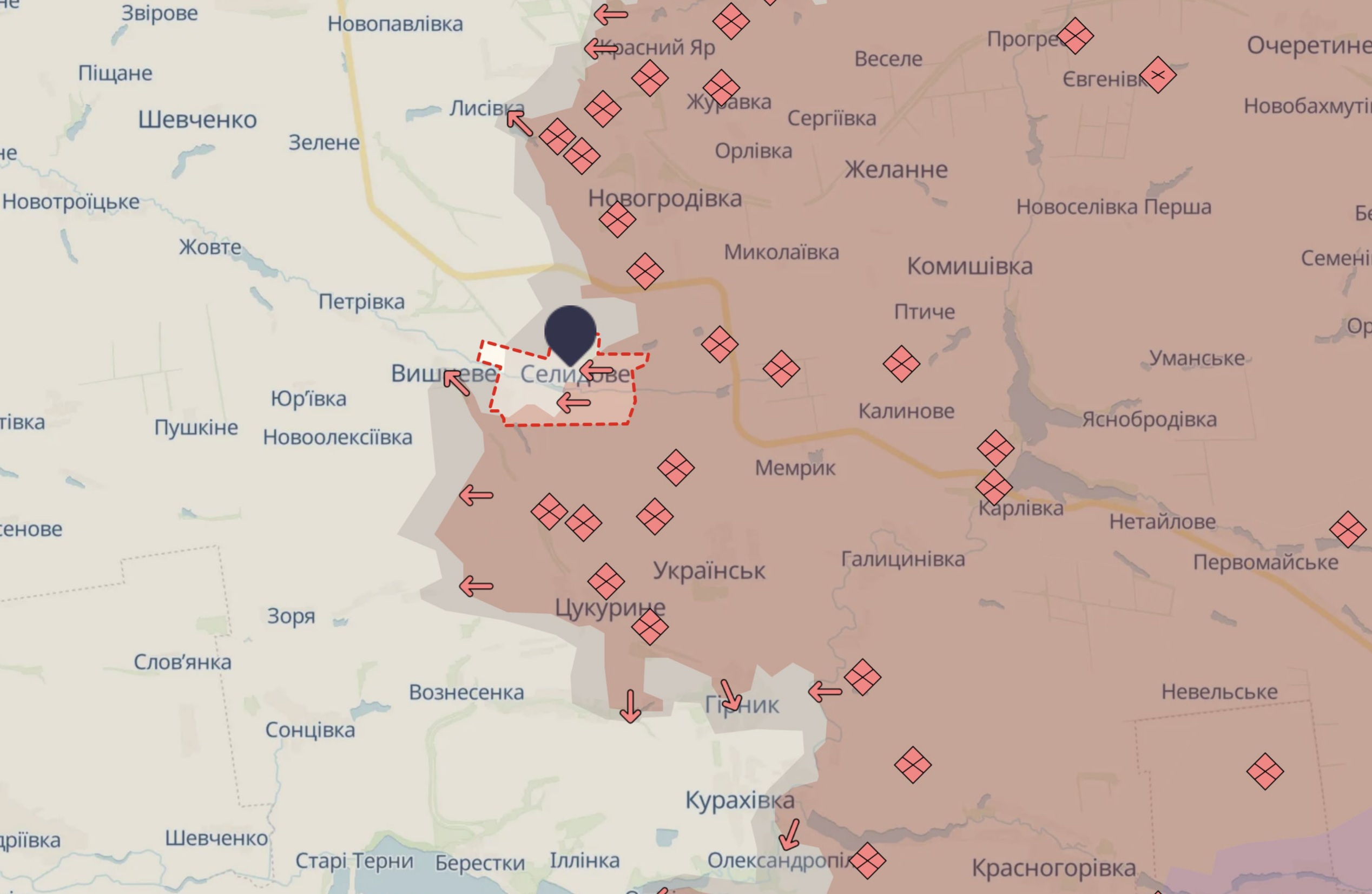 Спикер 15-й бригады оперативного назначения Национальной гвардии Украины "Кара-Даг" Виталий Миловидов заявил, что российские оккупационные войска стремятся полностью окружить город Селидово Донецкой области и заставить подразделения Вооруженных Сил Украины выйти из этого населенного пункта. Для этого россияне бросили на это направление значительные силы, сообщает NV.