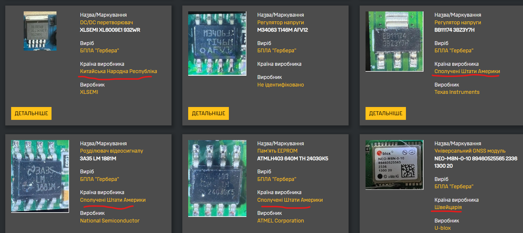 В то же время помехозащищенная антенна (CRPA) «Герберы» содержит чипы Analog Devices и Texas Instruments (США), NXP Semiconductors (Нидерланды). В универсальном полетном контроллере также есть компоненты, изготовленные компаниями Texas Instruments, Atmel (США), STMicroelectronics, U-Blox (Швейцария), NXP Semiconductors (Нидерланды), XLSEMI (КНР).