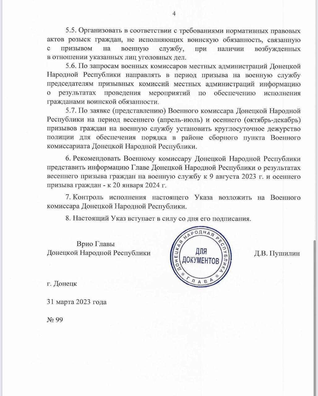 Согласно "документу", весенний призыв должен продлиться до 1 августа текущего года. Так называемый глава "ДНР" называет его "обязательной задачей", выполнение которой просит лично контролировать руководителей оккупационных администраций.