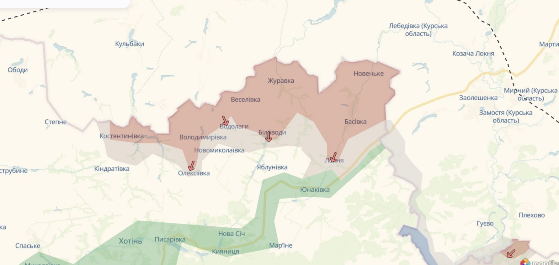 Под контролем россиян в Сумской области находятся Владимировка, Журавка, Новенькое, Веселовка, Басовка и части Локни и Беловодов. Аналитики DeepState утверждают, что РФ стремится продвинуться к населенным пунктам Юнаковка и Хотень.