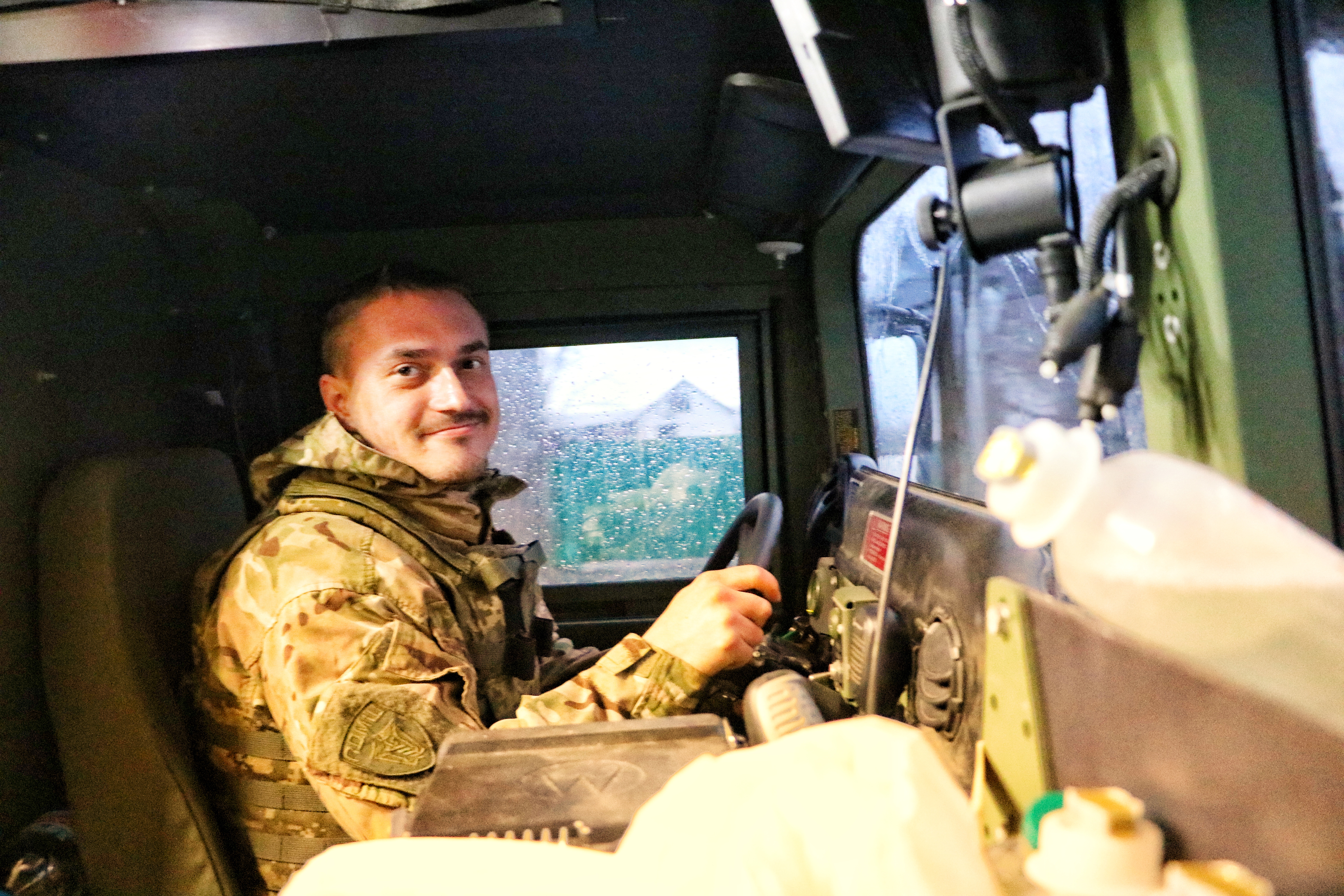 Мы останавливаемся в селе, в нескольких километрах от активных боевых действий. Здесь «Поляк» и «Полтава» вместе с медиками 95-й бригады ждут вызова. Если с боевых позиций поступит сообщение о раненом бойце, экипаж огромной машины, накрытой маскировочной сеткой, помчится его спасать.