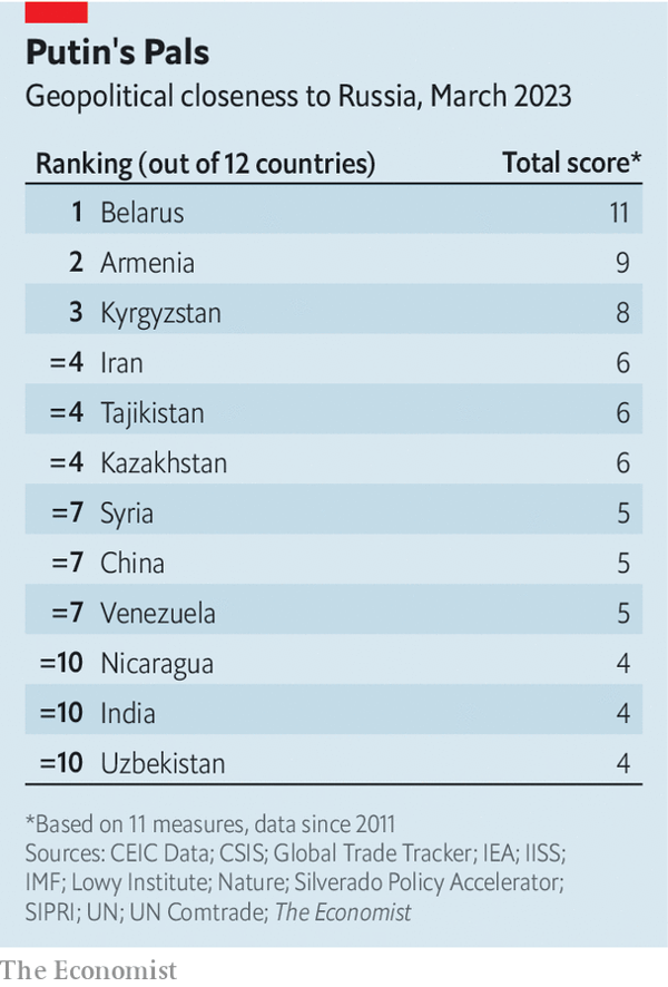 Дипломатическая устойчивость России заставляет многих на Западе ощущать пессимизм. Питер Франкопан, профессор истории Оксфордского университета, написал недавно, что недовольство Западом и заоблачные цены на энергоносители трансформируют международную систему в пользу России. Газеты, аналитические центры и эксперты жалуются, что Западу не удалось изолировать Россию или привлечь на свою сторону большое количество развивающихся стран. Однако данные, собранные The Economist по широкому спектру военных, экономических и дипломатических мер — назовем это индексом друзей Путина — демонстрируют более нечеткую картину.