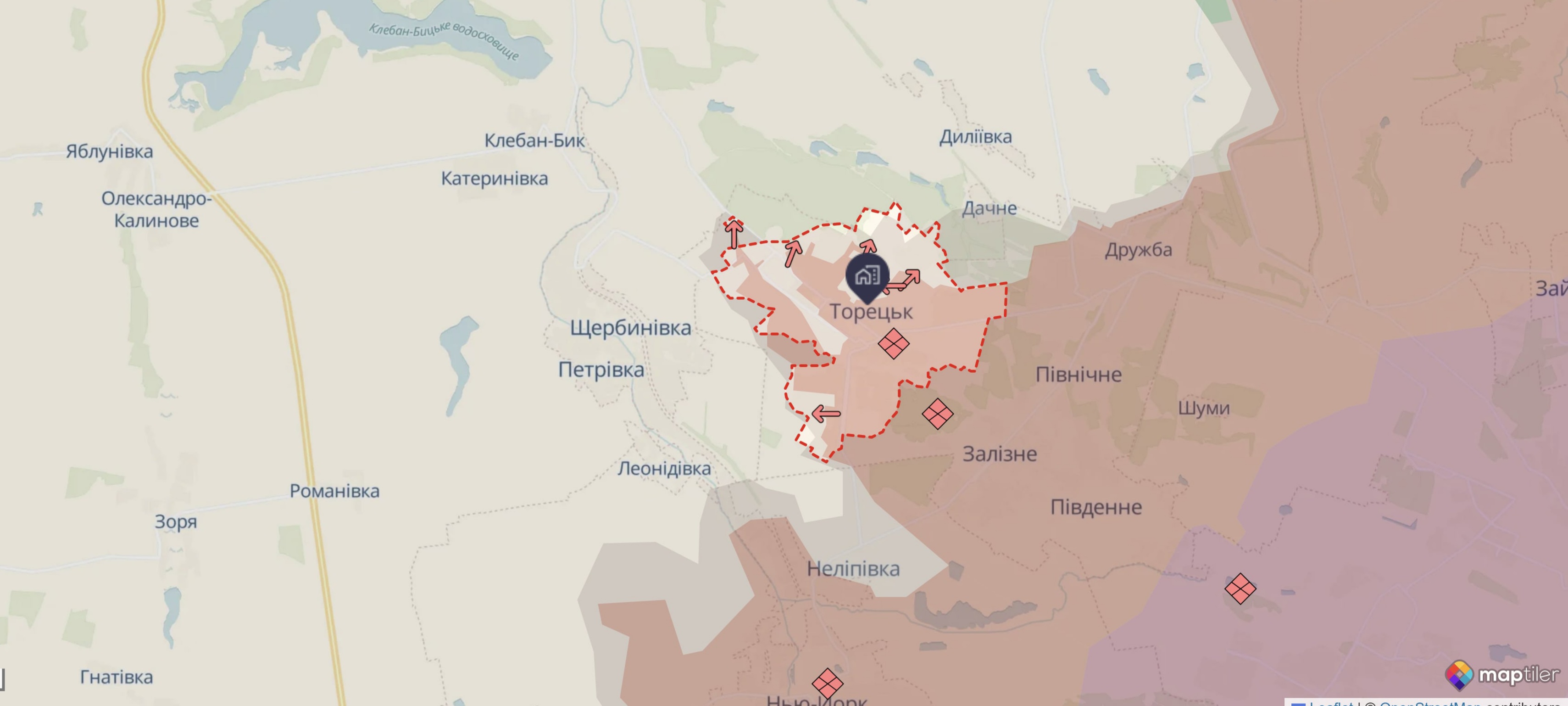 Аналитики DeepState указывают, что под контролем РФ находится практически весь центр Торецка, однако бои продолжаются на северных и западных окрестностях и в микрорайоне "Забалка". Украинский военный журналист Богдан Мирошников отметил, что шахта "Торецкая" стала для оккупантов настоящим бермудским треугольником.