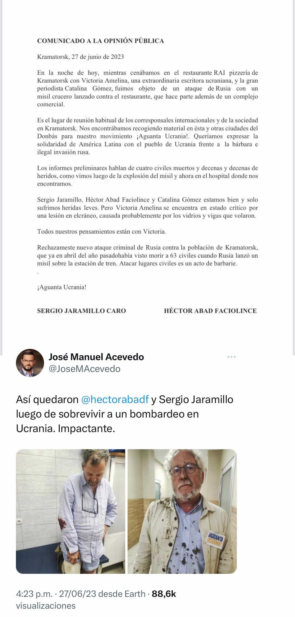 «Сегодня вечером, когда мы ужинали в ресторане-пиццерии RAI в Краматорске Викторией Амелиной, чрезвычайной украинской писательницей и выдающейся журналисткой Каталиной Гомес, мы стали объектом российской атаки крылатой ракетой по ресторану, который является частью торгового комплекса. Это обычное место встречи международных корреспондентов и Краматорского общества. Мы собирали материал в этом и других городах Донбасса для нашего движения «Держись, Украина!» Мы хотели выразить солидарность Латинской Америки с украинским народом против варварского и незаконного российского вторжения», – говорится в заявлении.