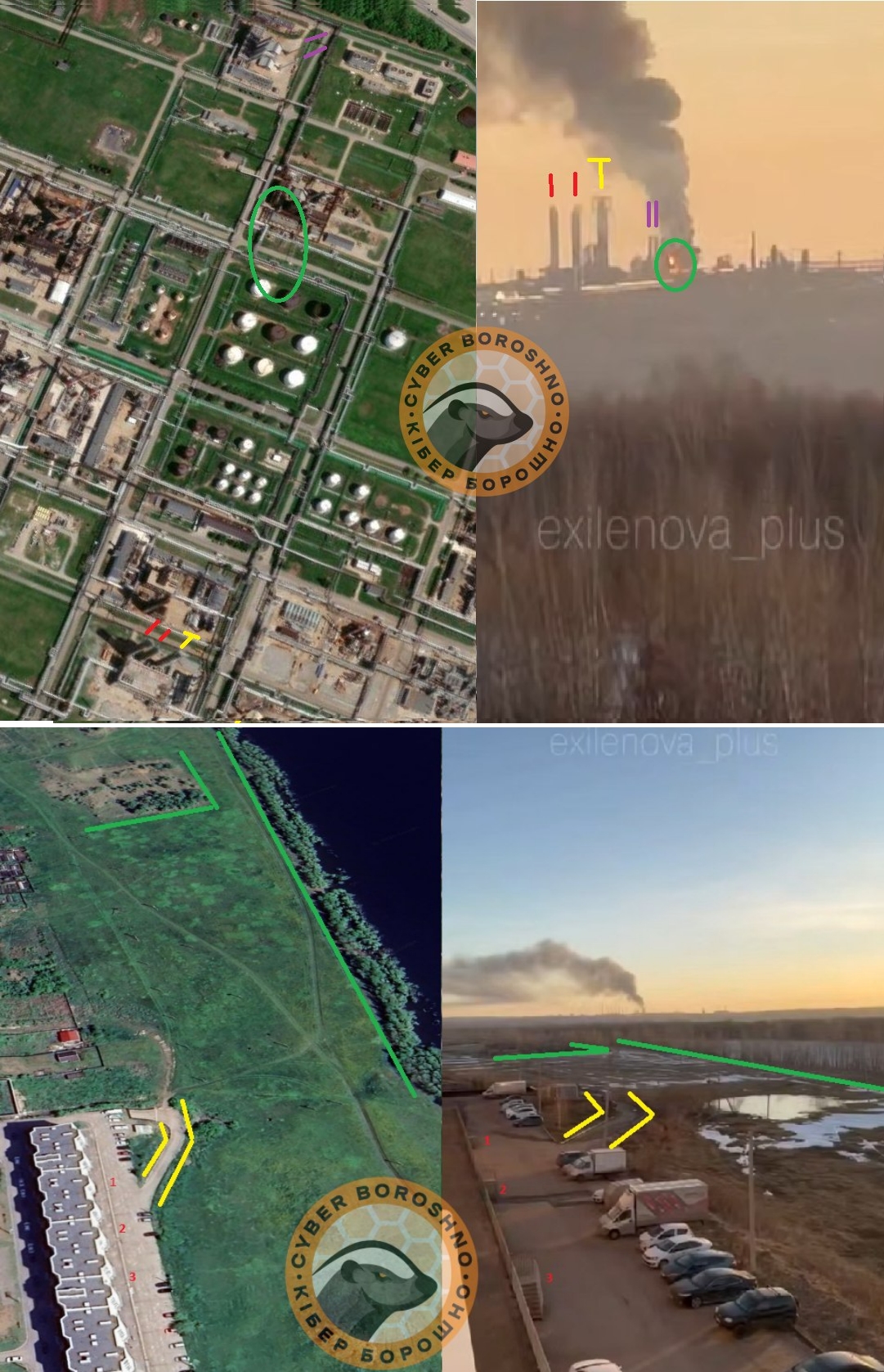 Аналитики украинского OSINT-сообщества "КиберБорошно" выяснили, что удар пришелся в район установки АВТ-5, после чего произошло масштабное возгорание с высвобождением большой массы черного дыма.