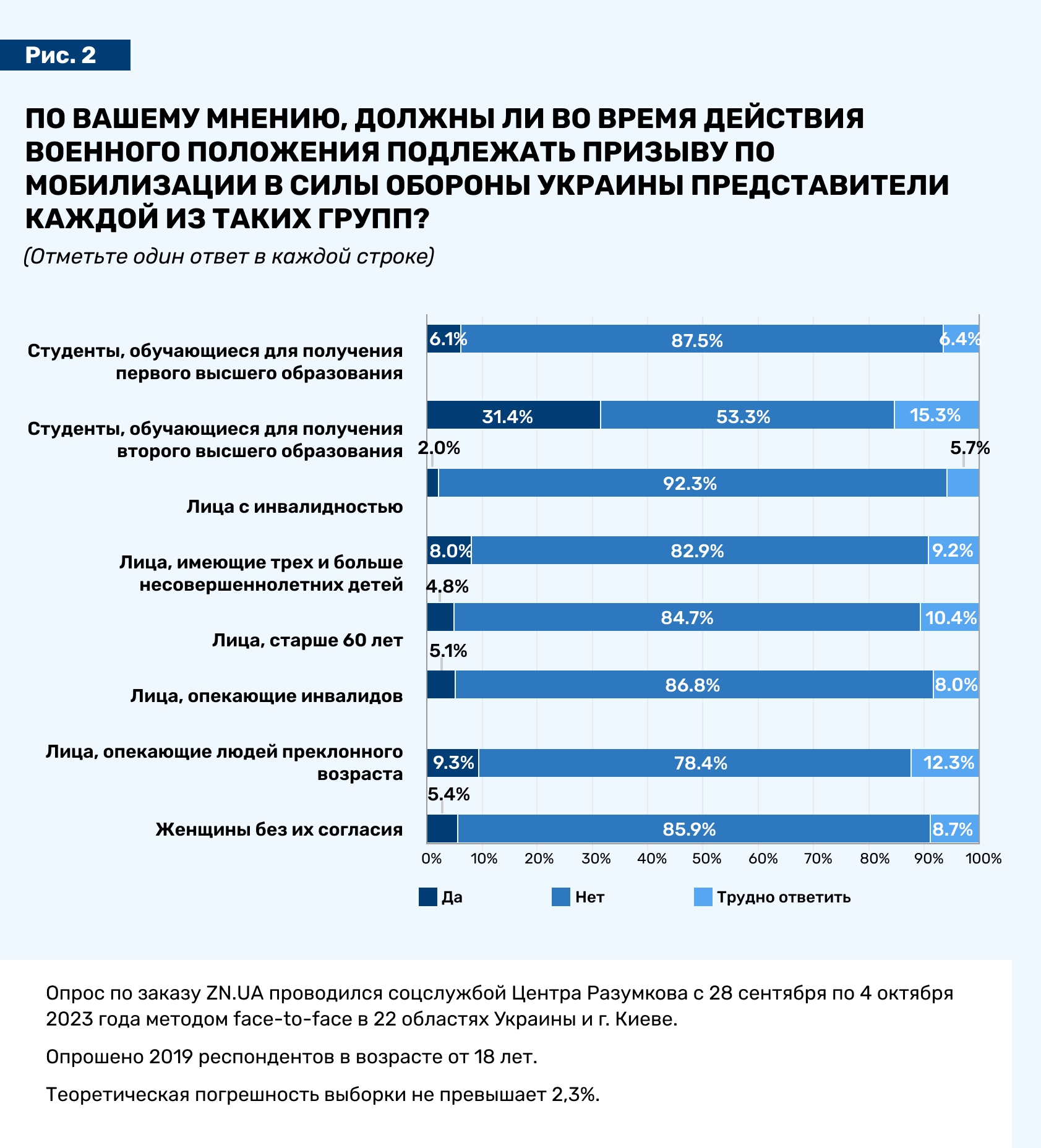 Тем более что законодательство предоставляет вполне достаточное количество легальных способов не попасть под мобилизацию. И судя по тому же опросу (вопрос звучал так: «По Вашему мнению, должны ли во время действия военного положения подлежать призыву по мобилизации в Силы обороны Украины представители каждой из таких групп?»), общество охотно их поддерживает (см. рис.2). Все категории, которые на сегодня не подлежат мобилизации, «одобрены» респондентами обоих полов следующим образом: лица с инвалидностью — 92,3% (91,6% — мужчин, 92,8% — женщин); студенты, получающие первое высшее образование — 87,5% (86 и 88,8% соответственно); опекуны лиц с инвалидностью — 86,8% (85,7 и 87,9%); женщины без их согласия — 85,9 % (85,2 и 86,5%); лица старше 60 лет — 84,7% (84,5 и 85%); лица, имеющие трех и более несовершеннолетних детей — 82,9% (по 82,9%); опекуны людей преклонного возраста — 78, 4% (77,9 и 78,8%); студенты, получающие второе высшее образование — 53,3% (52,2 и 54,1%).