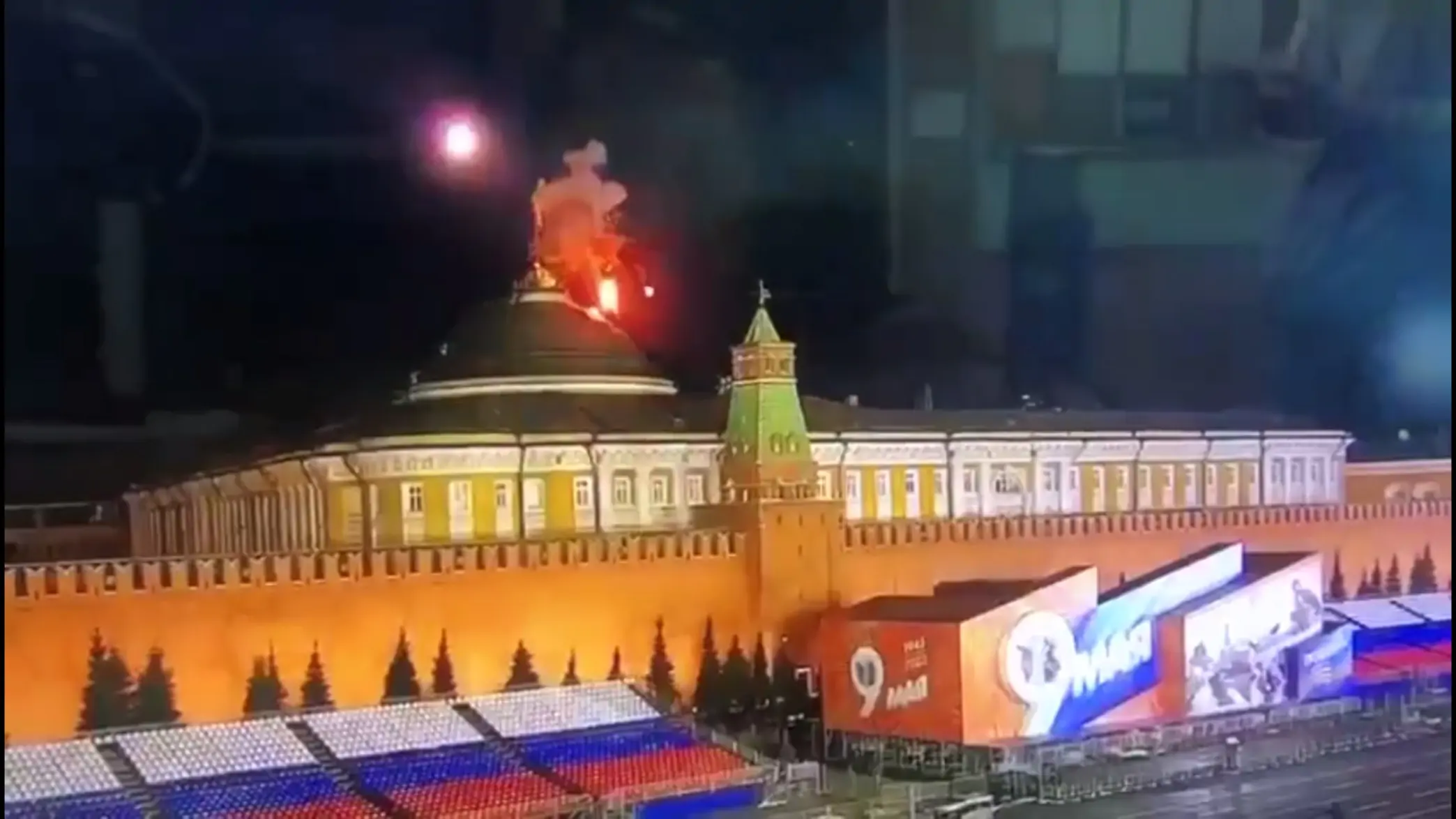 В ночь с 2 на 3 мая 2023 года два украинских беспилотника атаковали московский Кремль. Удар был нанесен по крыше Сенатского дворца, целились по главному флагу российской империи — первый беспилотник взорвался в воздухе на метровом расстоянии от полотнища, второй ударил по куполу возле подножия флагштока.
